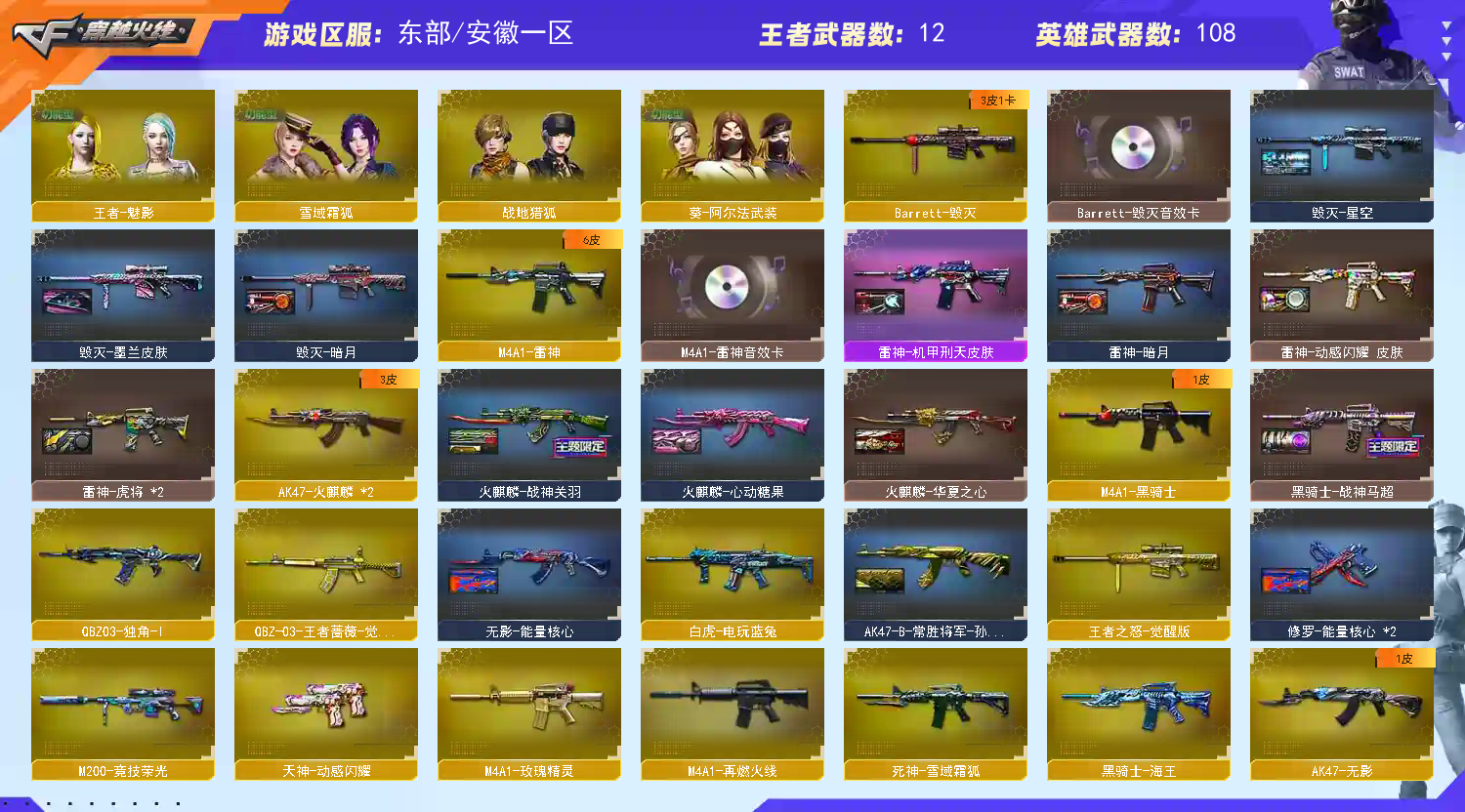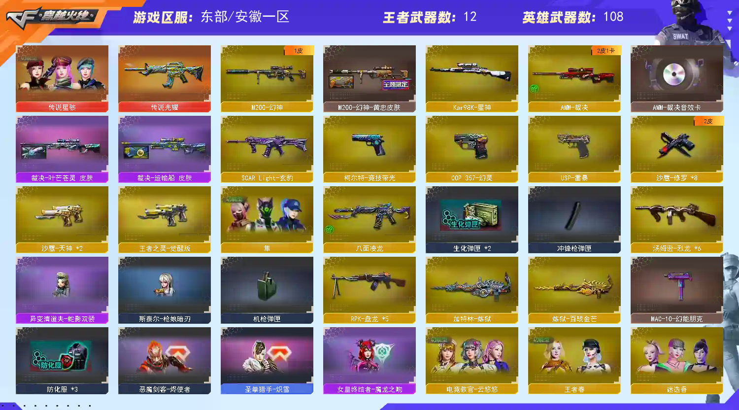 东部108v 四防传说星骇云悠悠隼 6列6盘双清道夫小人枪 八面凌龙 裁决带卡 幻神星神qbz白虎;USP-雷暴,传说星骇,隼,电竞教官-云悠悠,RPK-盘龙,M200-幻神,Kar98K-星神,