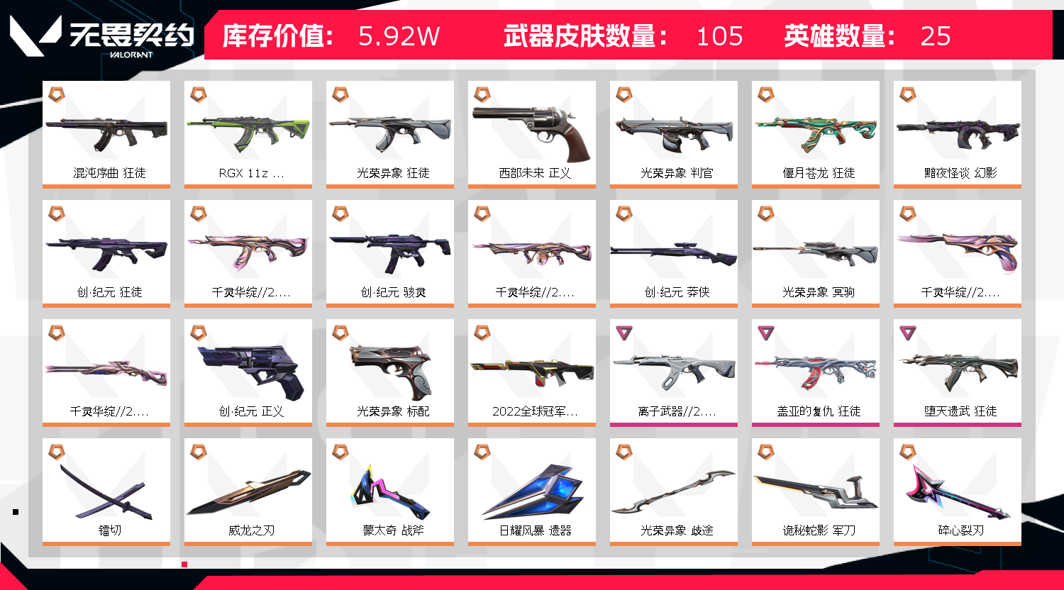 允许 英雄20 武器皮肤数量93;镭切,威龙之刃,盖亚的复仇 狂徒,RGX 11z Pro 狂徒,堕天遗武 狂徒,混沌序曲 狂徒,光荣异象 狂徒,