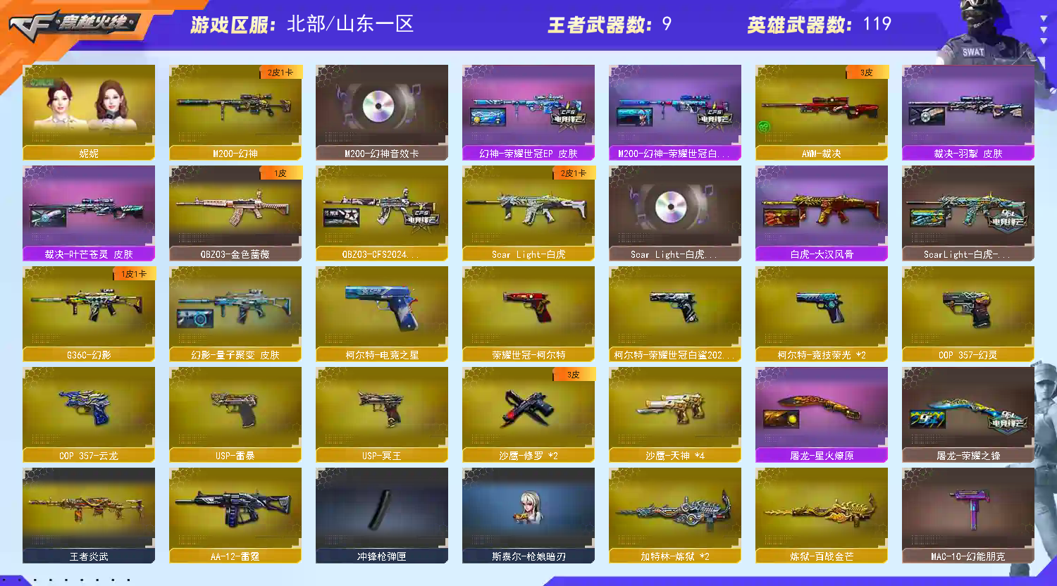 111111;USP-雷暴,荣耀世冠-柯尔特,柯尔特-荣耀世冠白鲨2023,电竞教官-云悠悠,妮妮,QBZ03-金色蔷薇,G36C-幻影,