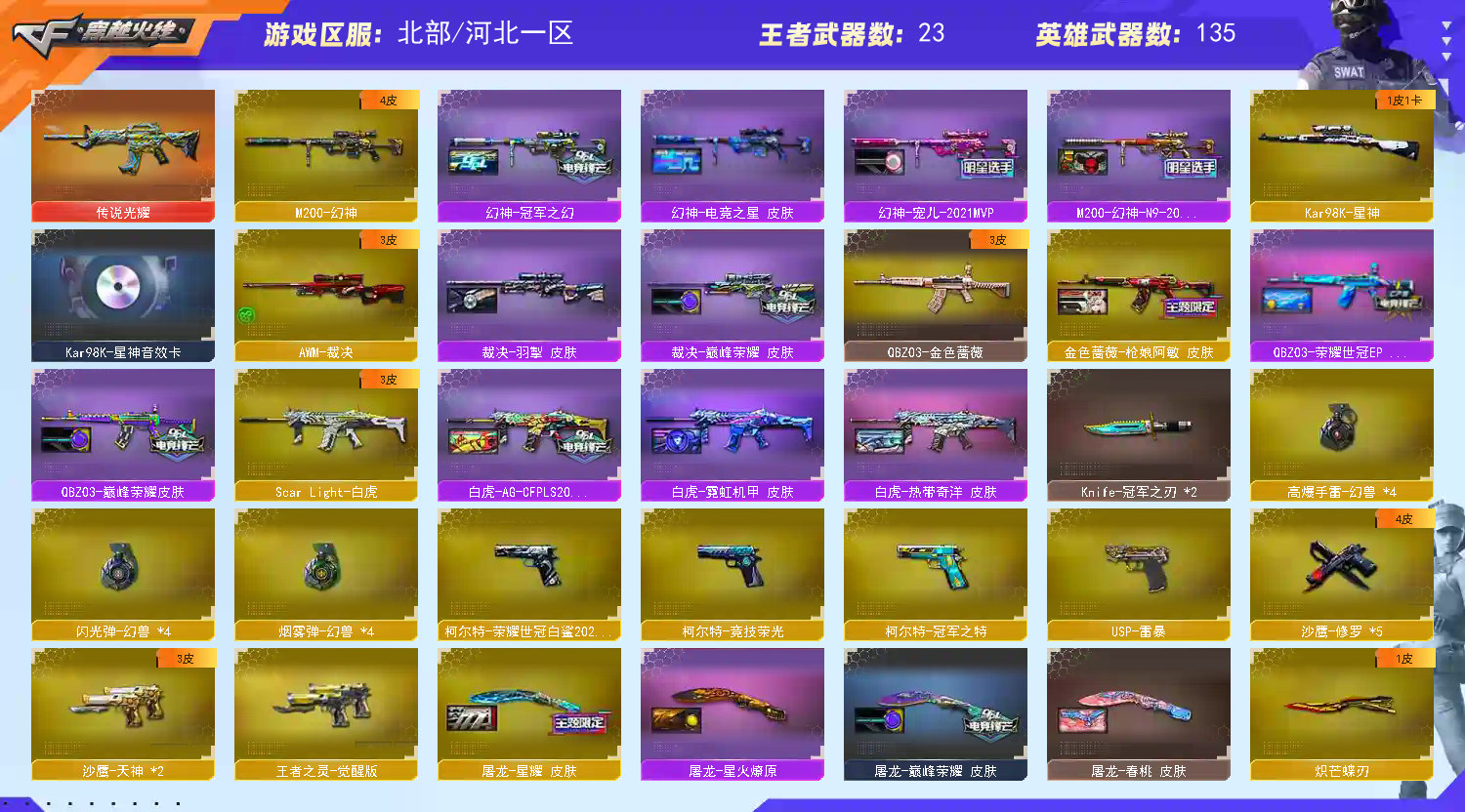 Kar98K-星神三件套+Knife-冠军之刃 挑战绝版武器 六烈+死亡之眼+蝴蝶刀】【M200-幻神+幻神-宠儿+幻神-冠军之幻+幻神-N9+电竞之星】【竞技荣光套+四防云悠悠+usp雷暴】【Kar98K-星神+音效卡+拼搏】【幻兽套+幻兽雷*4】【王者幻神】【王者星霆】【传说光耀】【ScarLight-白虎+霓虹机甲+ag20冠军】【QBZ03-金色蔷薇】【生化 2炼狱 6烈龙 蝴蝶刀+荣耀世冠白鲨2023】【挑战 擎天柱】【裁决+巅峰荣耀】【Barrett-毁灭+音效卡】【极光】【AK47-火麒麟+音效卡+传奇石头-横秒之巅】【黑龙+音效卡】【M4A1-雷神+音效卡+巅峰荣耀+雷神-lgd18冠军+雷神-传奇n9+雷神-宠儿+雷神-荣耀之魄】【黑骑士+音效卡】【王者之魄 王者之戮 王者之鲨 王者之怒】【无影 死神 黑武士 天启 超新星 机械迷城 玫瑰精灵】【19手枪 修罗*5 天神*2 usp雷暴 柯尔特荣耀世冠白鲨2023 王者之灵 柯尔特-冠军之特】【25近战 屠龙*3 龙啸*2 擎天*3 麒麟刺*2 炽芒蝶刃蝴蝶刀 王者之锋 王者之啸】【手雷 堕天神 幻灵雷 竞技荣光】【四防 王者春 王者迷迭香 王者瞳闭月羞花 】【Barrett-毁灭音效卡 AK47-火麒麟音效卡 黑龙音效卡 黑骑士音效卡;USP-雷暴,柯尔特-荣耀世冠白鲨2023,柯尔特-冠军之特,炽芒蝶刃,Knife-冠军之刃,电竞教官-云悠悠,QBZ03-金色蔷薇,