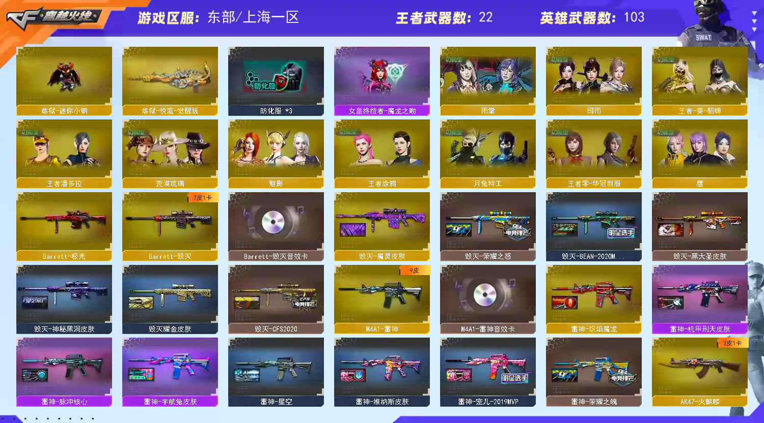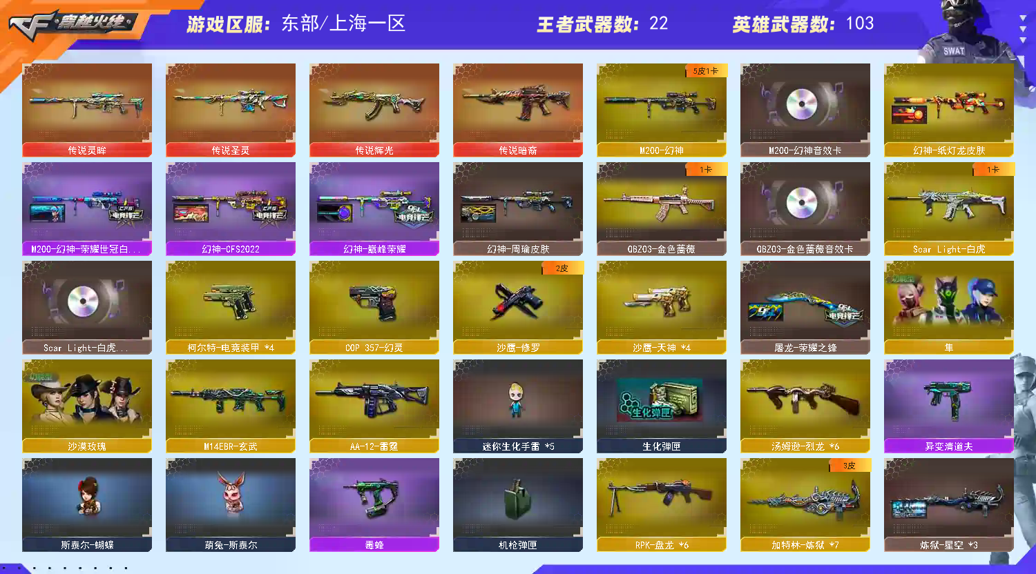 【传说灵眸 传说暗裔 传说辉光 传说圣灵】【m200幻神+幻神音效卡+荣耀世冠白鲨+纸灯龙+巅峰荣耀+周瑜+cfs2022】【王者星神 王者风神 】【6盘龙 6炼狱 6烈龙 炼狱小刚 异变清道夫 斯太尔蝴蝶 隼】【scar白虎+白虎音效卡+白虎电玩】【qbz金色蔷薇+卡】【朱雀】【玄武】【火麒麟+卡+巅峰荣耀】【黑龙+卡】【雷神+卡+荣耀之魄+宠儿】【黑骑士+卡+冠军之势】【毁灭+卡+荣耀之怒+bean+cfs2018】【极光】【武器:武圣 青龙 王者之心 王者之魄 王者火魄 王者白虎 qbz王者蔷薇 王者青龙 王者龙血 白虎电玩】【10手枪:修罗 天神*4 武圣 电竞装甲*4 幻灵 王者之魂 】【14刀具:屠龙*3 龙啸 擎天 麒麟刺 幻灵之峰 王者之锋 王者之啸 王者之击 王者玉锋】【7雷套:电竞装甲*3 幻灵雷*4 】【小人枪:雷神精英刀锋 金色蔷薇空】【音效卡:星神音效卡 雷神音效卡 毁灭音效卡 火麒麟音效卡 幻神音效卡 黑骑士音效卡 黑龙音效卡 白虎音效卡 金色蔷薇音效卡 】【四防角色:王者葵貂蝉 王者潘多拉 职业经理】;沙漠玫瑰,隼,RPK-盘龙,QBZ03-金色蔷薇,M200-幻神,Scar Light-白虎,传说灵眸,
