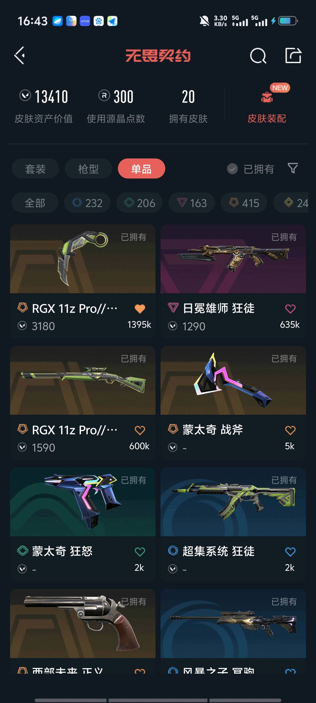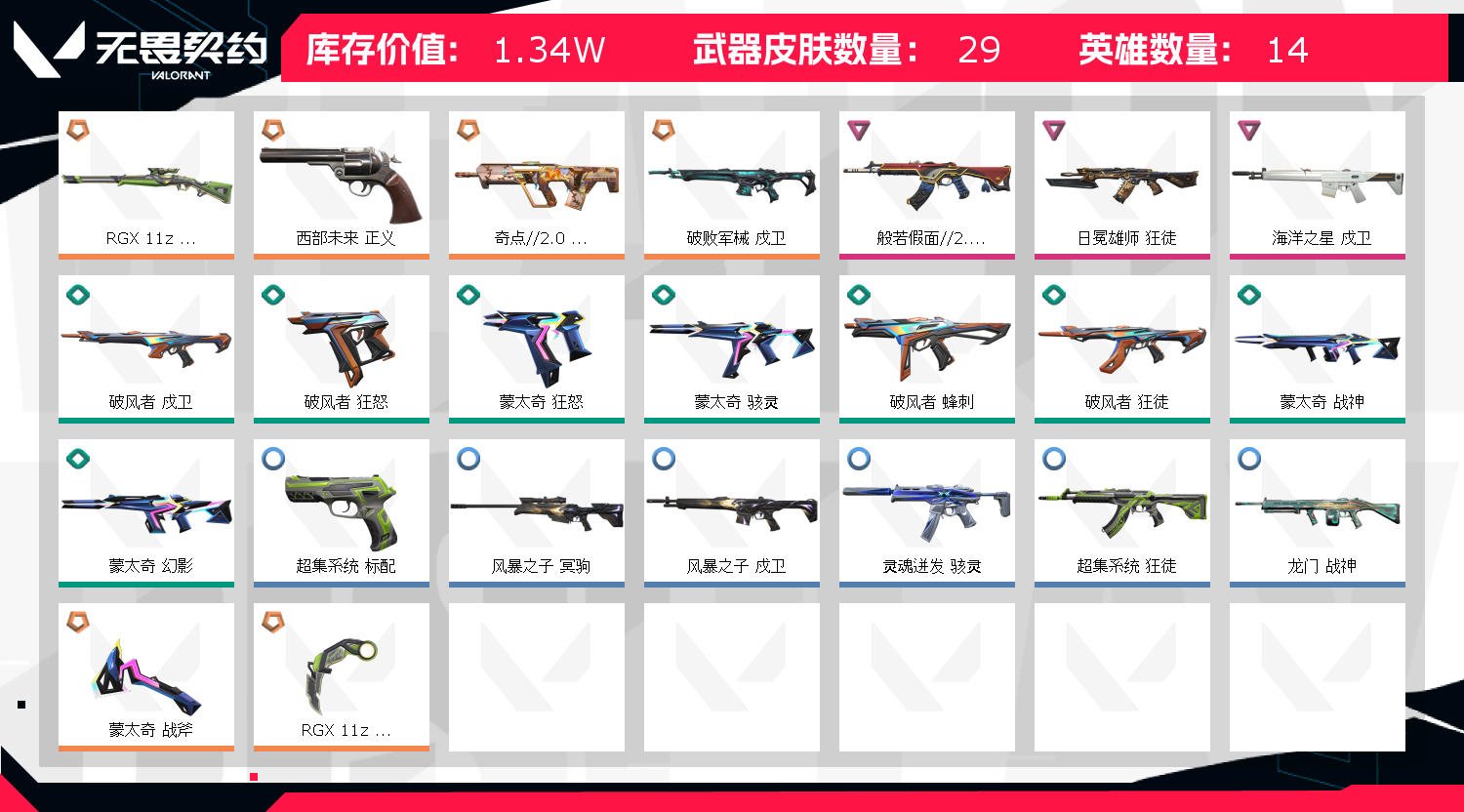 英雄13 武器皮肤数量20 黄金一 可打排位 显卡爪刀 奇点狂徒 西部未来正义 破败军械戍卫 等等;RGX 11z Pro//3.0 莽侠,西部未来 正义,