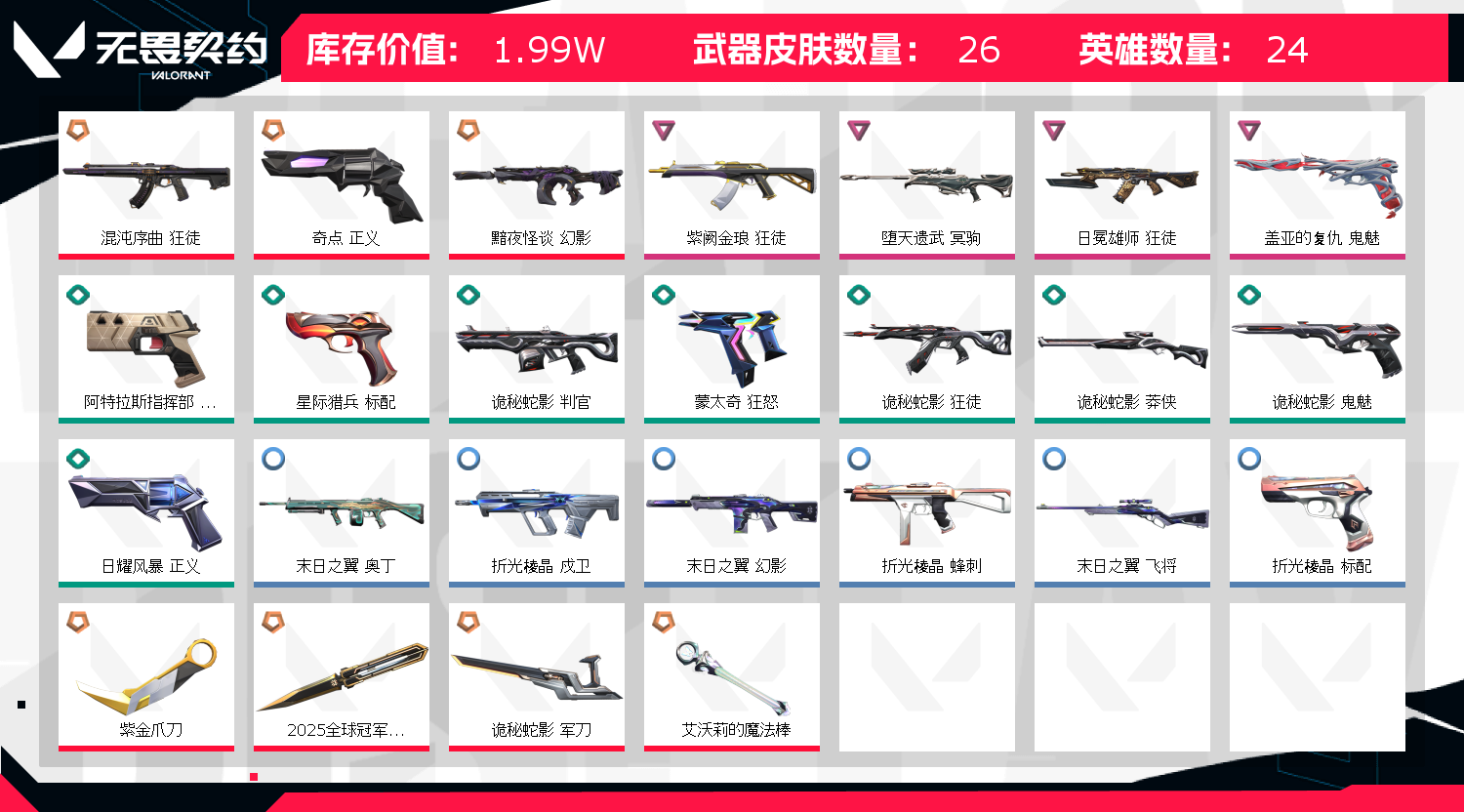 允许 英雄28 武器皮肤数量23;紫金爪刀,紫阙金琅 狂徒,混沌序曲 狂徒,堕天遗武 冥驹,奇点 正义,