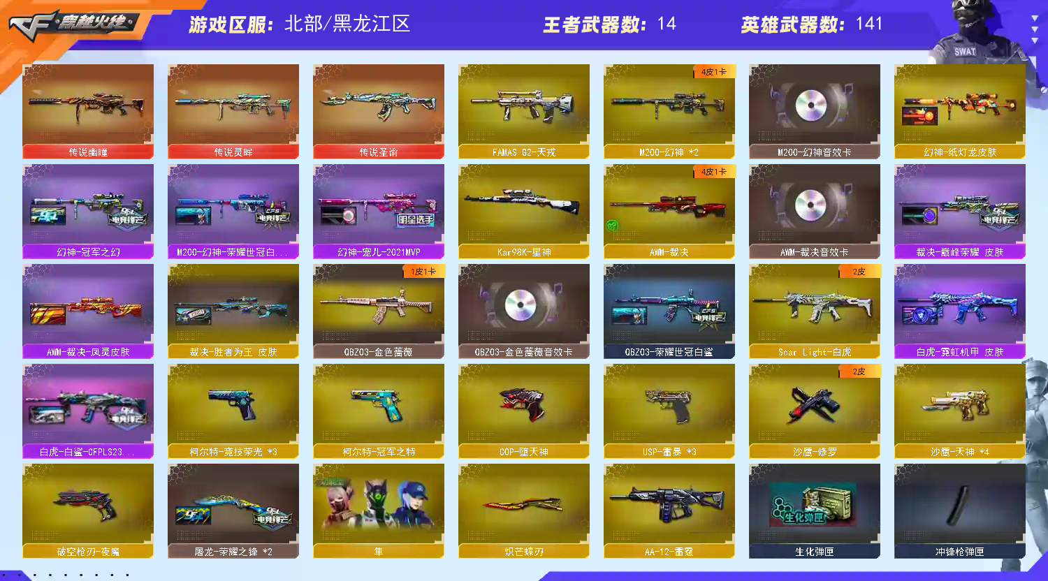 该账号已经过虚拟财产认定,若使用科技和鼠标宏等特殊外设导致账号出现问题,必追究法律责任!祝老板玩的愉快;USP-雷暴,柯尔特-冠军之特,炽芒蝶刃,隼,电竞教官-云悠悠,RPK-盘龙,QBZ03-金色蔷薇,