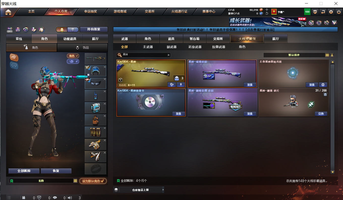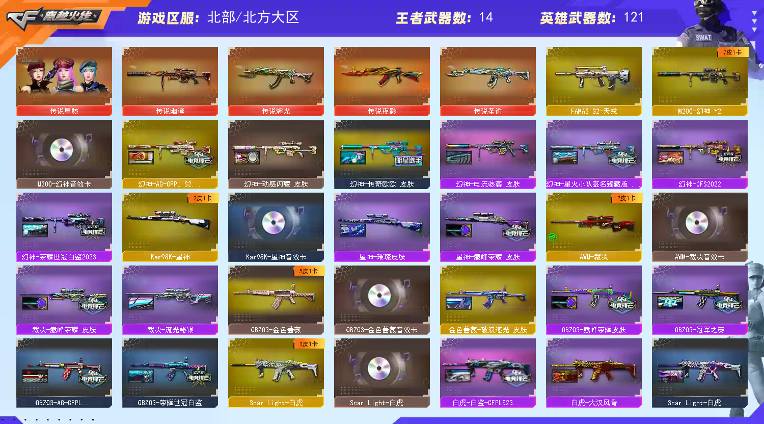 2个四防角色/星神/裁决/白虎/qbz金色蔷薇/都有音效卡;USP-雷暴,柯尔特-无冕之王,USP-雷暴王者,柯尔特-荣耀世冠白鲨2023,炽芒蝶刃,Knife-冠军之刃,传说星骇,