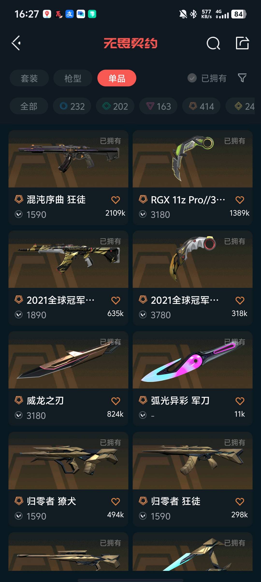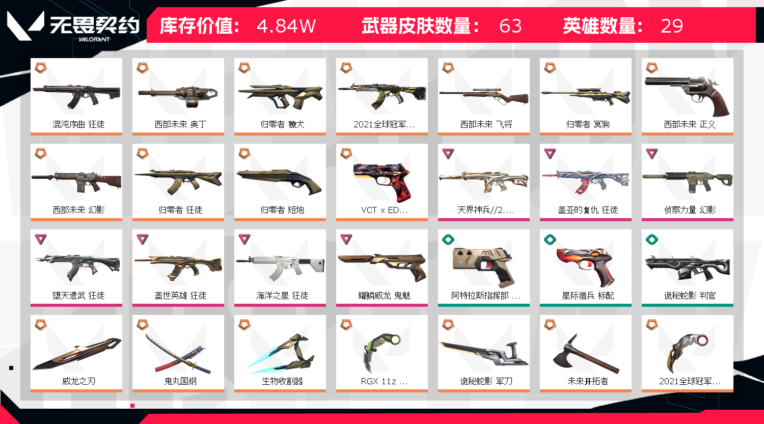 首页 > 租号大厅 > 无畏契约-wegame > wegame/wegame > 21冠军套西部未来套归零套龙年套盖亚狂徒混沌狂徒猴子狂徒侦查幻影天界幻影太刀显卡爪