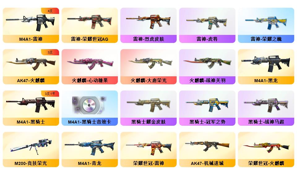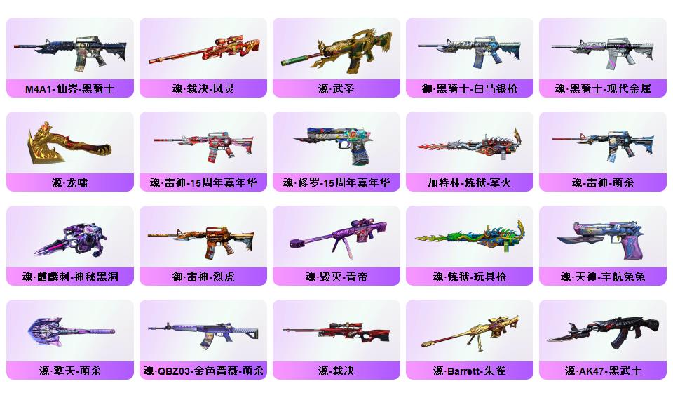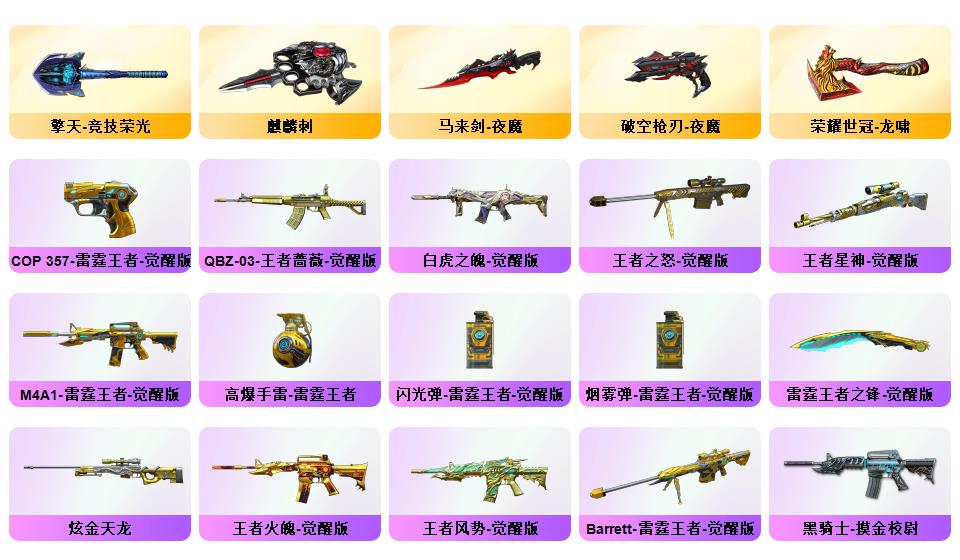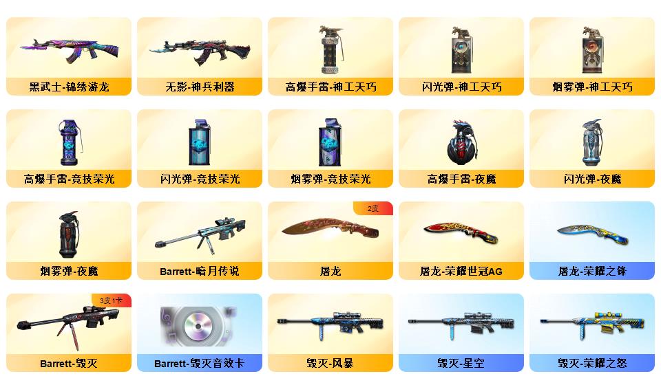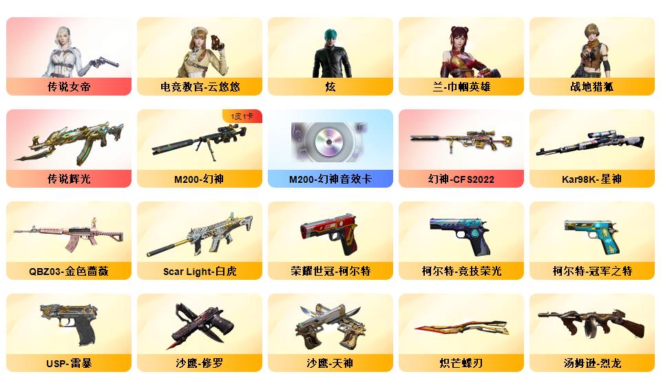 传说女帝、传说辉光、幻神+CF2022+音效卡、白虎、QBZ金色蔷薇、白虎之魄、星神、m200竞技荣光套*2、冠军之特、炽芒蝶刃