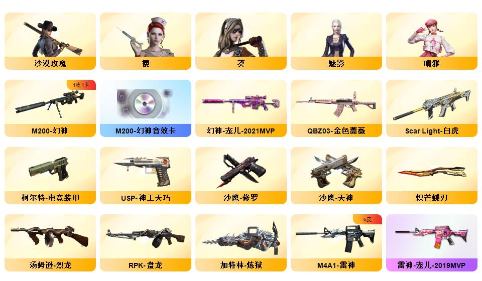炽芒蝶刃/传说灵眸/M200-幻神/幻神宠儿皮肤/幻神音效卡/电竞装甲套装/神功天巧套装/Scar Light-白虎/QBZ03-金色蔷薇/RPK-盘龙(6)/