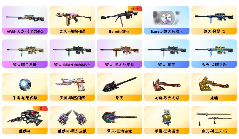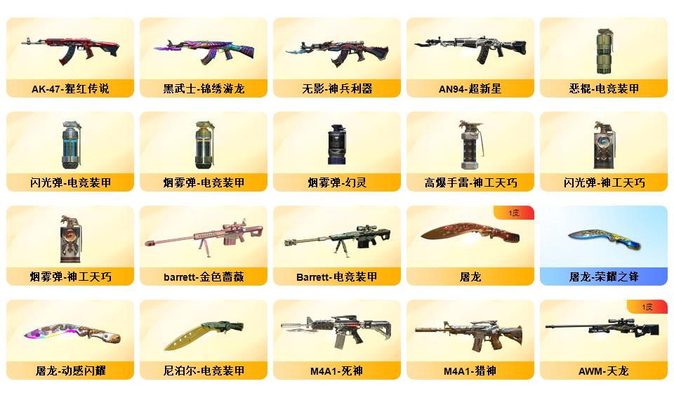 炽芒蝶刃/传说灵眸/M200-幻神/幻神宠儿皮肤/幻神音效卡/电竞装甲套装/神功天巧套装/Scar Light-白虎/QBZ03-金色蔷薇/RPK-盘龙(6)/汤姆逊-烈龙(6)/雷神宠儿