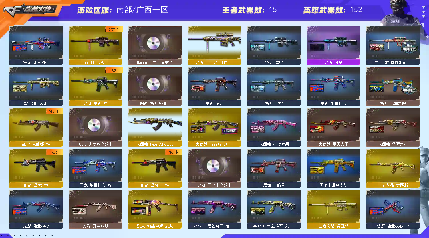【M200幻神女团皮肤】【M200竞技荣光套装+4防云悠悠】【白虎+白虎暗星皮肤】【qbz03金色蔷薇+破浪逐光皮肤】【8烈龙+6盘龙+2炼狱+斯泰尔蝴蝶】【幻灵套装】【qbz191银翼】【王者雷影 王者芳薇 王者之魄 王者之圣 王者之武 王者之怒】【火麒麟+火麒麟音效卡+女团皮肤】【雷神+雷神音效卡+荣耀之魄皮肤】【6黑骑士+黑骑士音效卡】【毁灭+毁灭音效卡+CFPLS16冠军皮肤+女团皮肤】【裁决+流光秘银皮肤】【千变 黑龙 无影 死神 黑武士 天启 超新星 武圣 机械迷城 龙血 青龙 玄武 源雷神III 穹宇 玫瑰精灵 猎神 猩红传说 战士 战神 身先士卒 常胜将军 天龙 极光 巴雷特朱雀 巴雷特金色蔷薇 巴雷特暗月传说 AA12雷霆】——【沙鹰修罗*7 沙鹰天神*2 武圣 cop357幻灵 柯尔特竞技荣光】——【屠龙 龙啸 擎天 麒麟刺 尼泊尔雷霆 斩神刀雷暴 麒麟刺堕天神 龙啸堕天神 幻灵之锋 擎天竞技荣光 王者之啸】——【雷暴投掷武器套装*2 堕天神投掷武器套装*2 幻灵投掷武器套装*3 竞技荣光投掷武器套装*3】——【热门武器/小人枪】【M4A1赤狱骑士 AN91竞魂超新星 AWM昌龙 雷神小红 炫金火麒麟 炫金雷神 炫金千变 炫金武士 裁决雪莉杨 天龙曼陀罗 炫金毁灭】——【角色】【4防(云悠悠 影豹 王者影豹)】【葵 零 樱 战地猎狐】;电竞教官-云悠悠,RPK-盘龙,QBZ03-金色蔷薇,Scar Light-白虎,