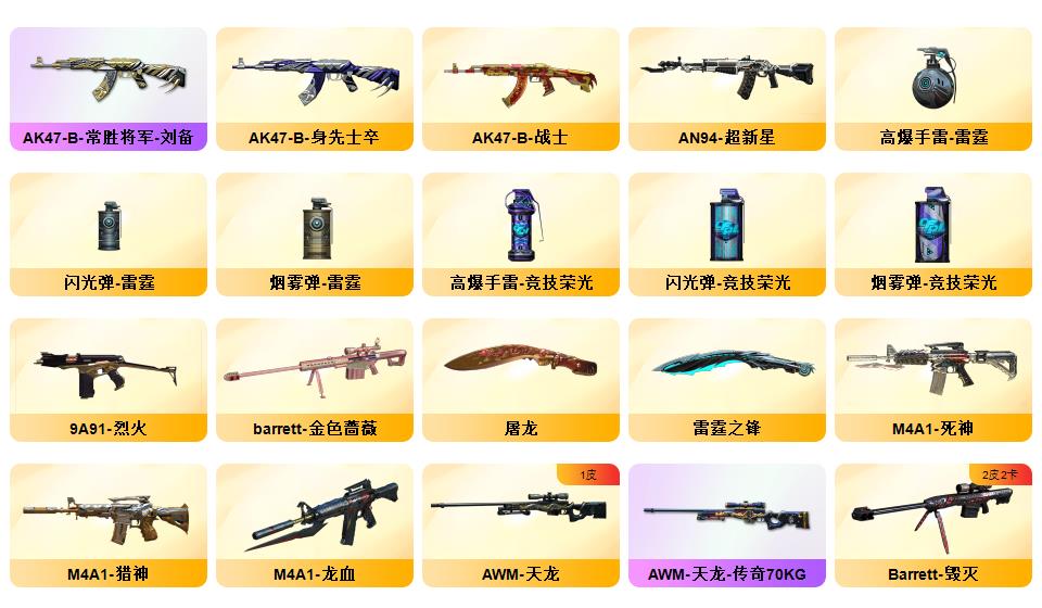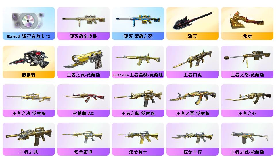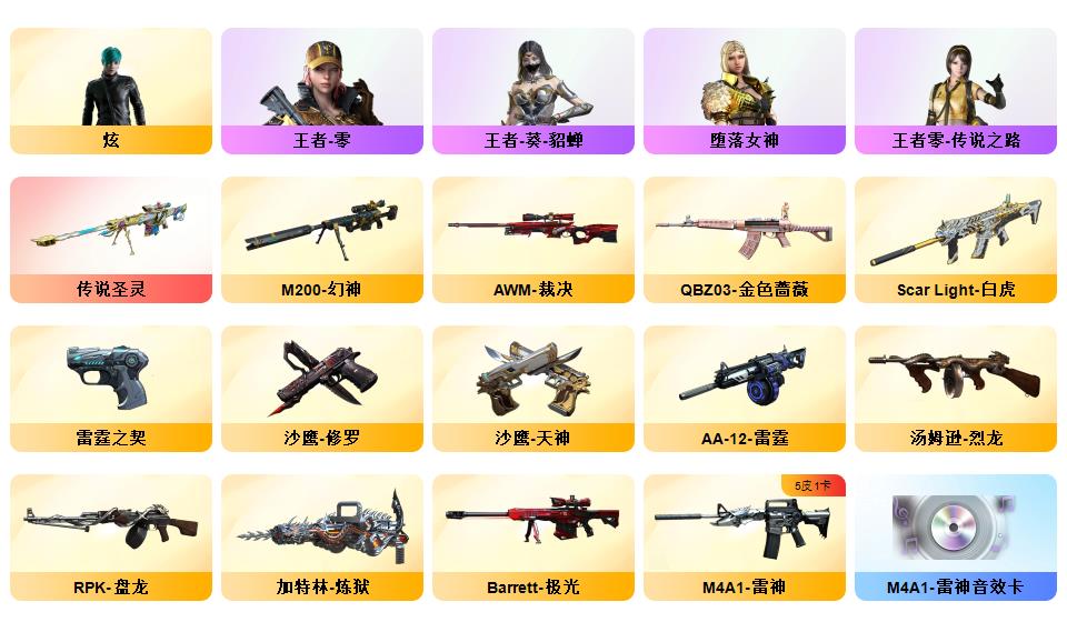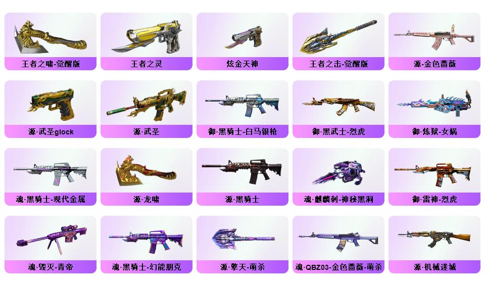 MLY/94V16王者/M200-幻神/传说圣灵/死亡+6烈,炼狱+6盘龙/毁灭+荣耀之怒+耀金+音效卡/雷神+荣耀之魄+音效卡/火麒麟+轻羽+雷神皮+华夏之心+音效卡/黑骑士+耀金+音效卡/王者QBZ,王者白虎,王者之烈,王者之翼,王者之心,王者之魄,王者之武,王者之决,王者之怒,王者之击,王者之啸,王者之灵/Scar-白虎,QBZ金色蔷薇,黑龙,死神,超新星,烈火,猎神,龙血,黑鲨,机械迷城,天启,冰龙粉碎者/极光,天龙,裁决,巴雷特-金色蔷薇,天龙-曼陀罗/AA-12