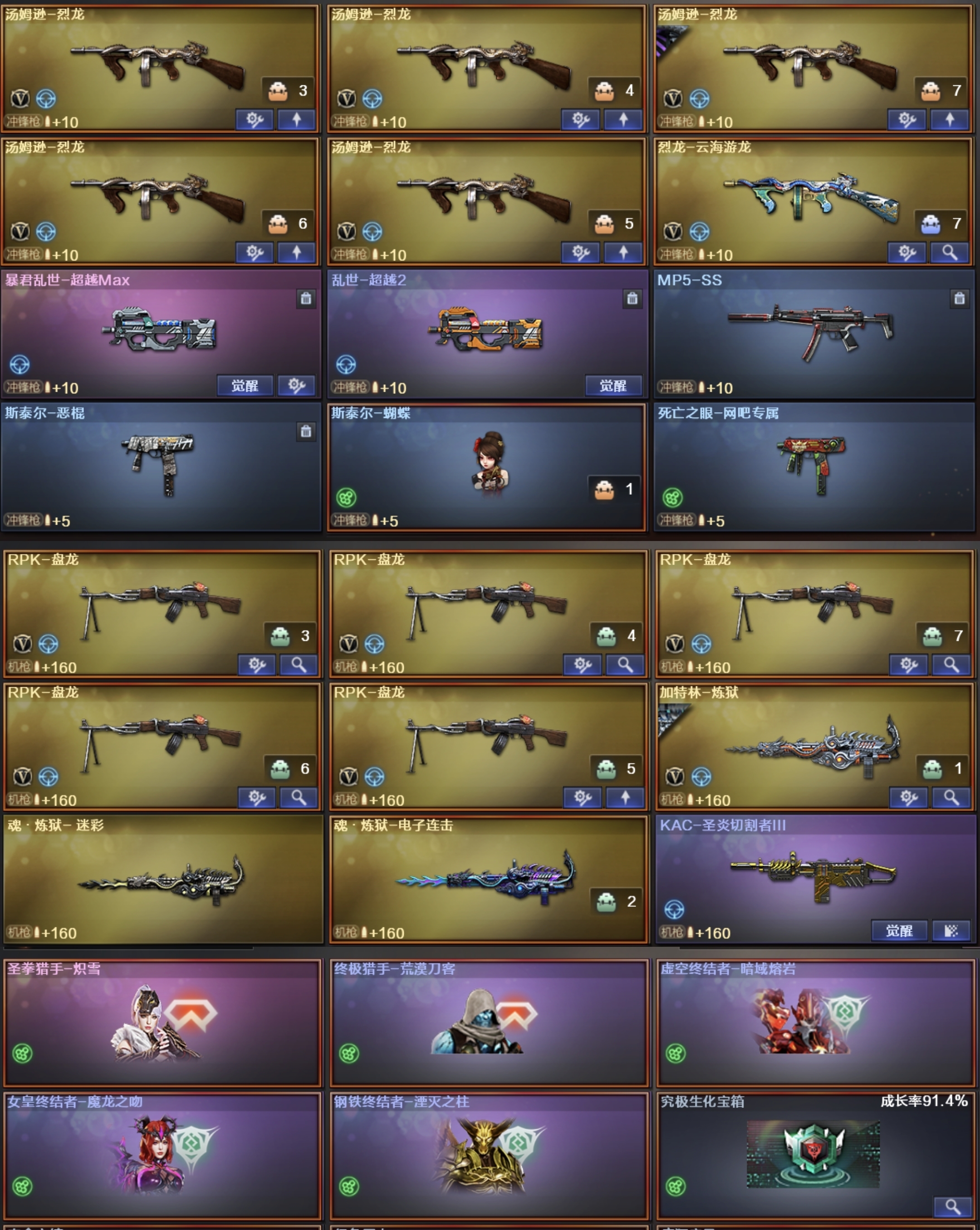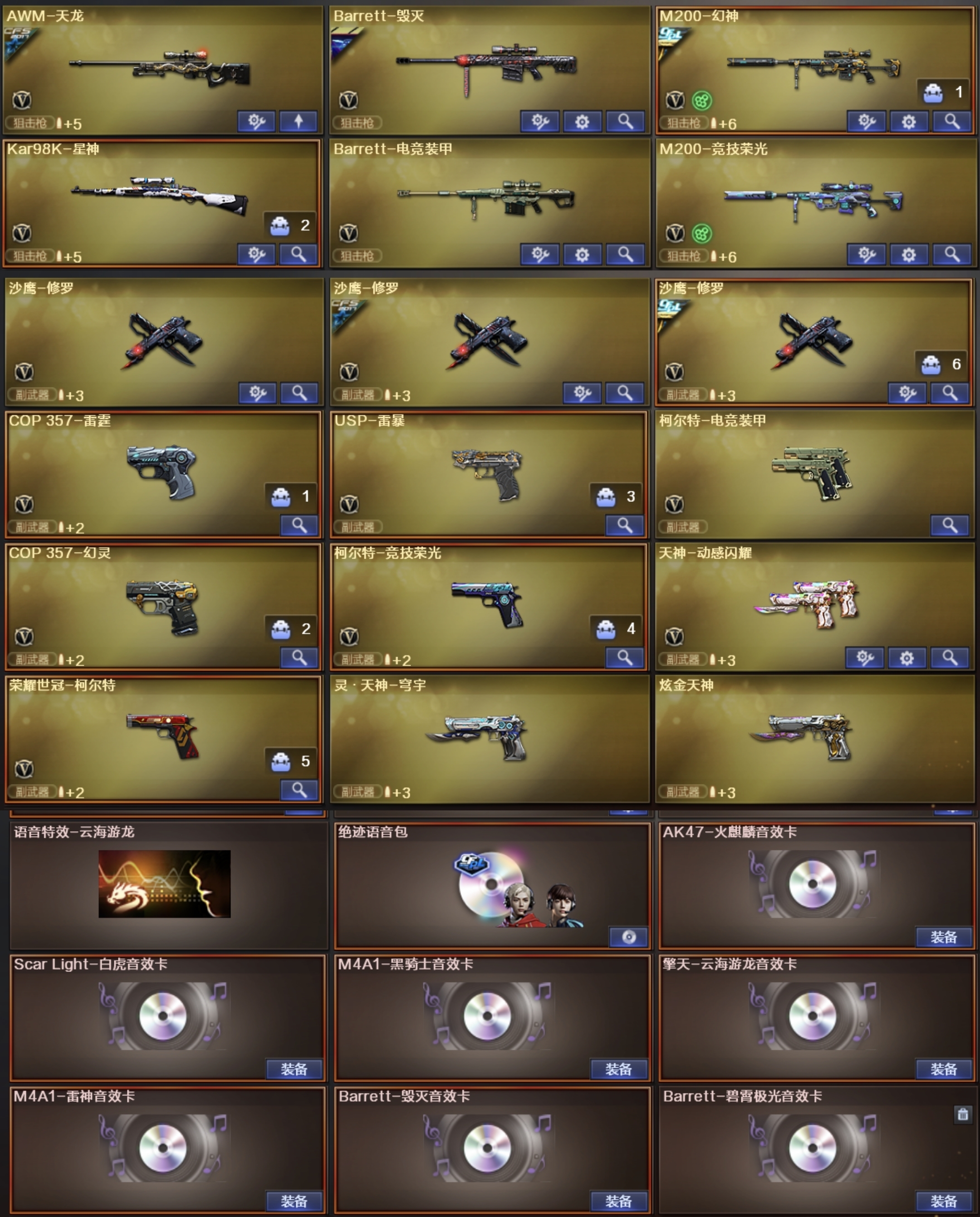南部126v 4防隼玫瑰云悠悠 5烈5盘蝴蝶 炽芒蝶刃 幻神冠军皮 6音效卡 5质量手枪;USP-雷暴,荣耀世冠-柯尔特,炽芒蝶刃,沙漠玫瑰,隼,电竞教官-云悠悠,RPK-盘龙,