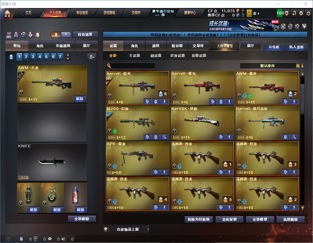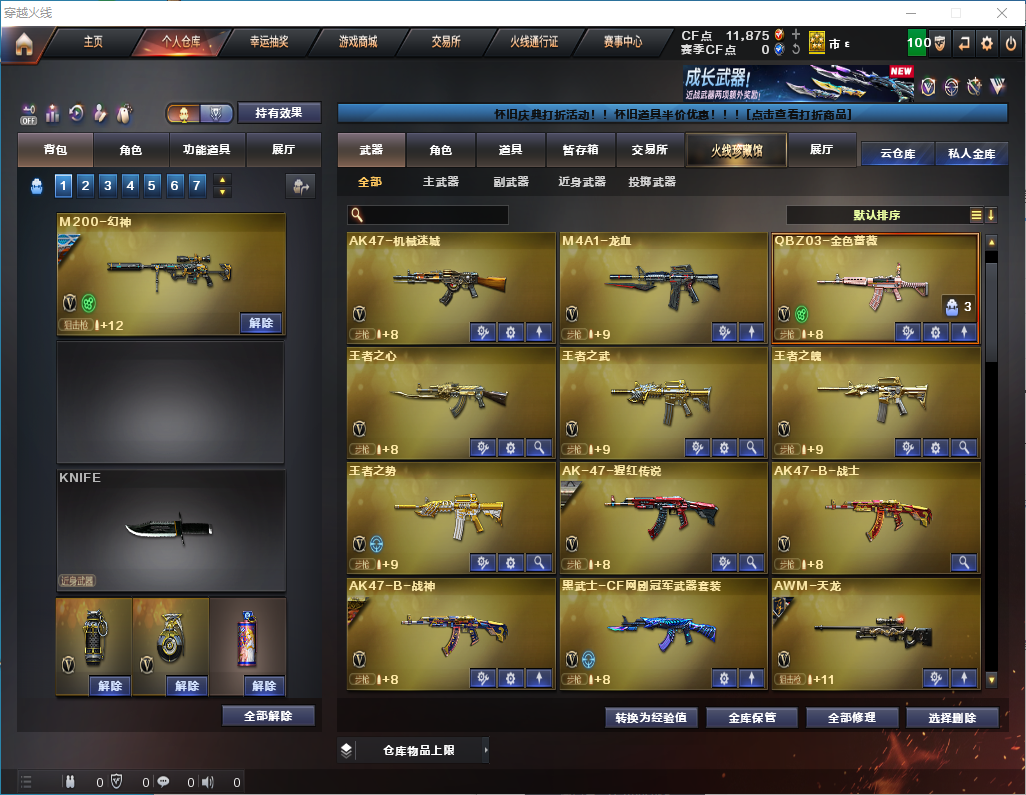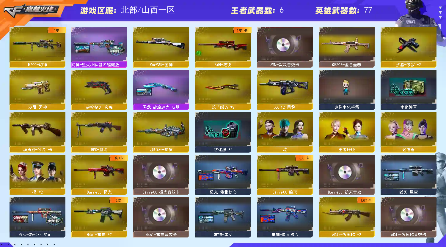 【幻神+星火小队皮肤】【火麒麟3件套】【雷神3件套】【黑骑士+卡】5烈龙/炽芒蝶刃 【步枪】火麒麟/黑龙/雷神/黑骑士/无影/死神/天启/超新星/机械迷城/龙血/QBZ金色蔷薇/王者之心/王者之武/王者之魄/王者之势/火麒麟绝迹/王者之心/炫金雷神/ 【狙击枪】天龙/毁灭/激光/裁决/幻神/星神/炫金毁灭/ 【机枪】盘龙/ 【冲锋枪】烈龙x5/死亡之眼/AA12雷霆/ 【散弹枪】 【挑战强化武器】黑骑士/超新星/王者之势/黑武士CF网剧冠军武器套装/裁决/盘龙/烈龙x5/ 【生化武器】死神/QBZ金色蔷薇/裁决/幻神/AA12雷霆/死亡之眼/ 【手枪】修罗/破空枪刃/天神CF网剧冠军武器套装/ 【刀】屠龙/战神刀雷暴/麒麟刺堕天神/龙啸堕天神/马来剑夜魔/炽芒蝶刃/王者之击/擎天CF网剧冠军武器套装/ 【手雷】雷暴手雷x2/堕天神手雷x2/夜魔雷暴x3/经济荣光手雷/闪光弹雷暴/堕天神闪光x2/夜魔闪光弹x3/经济荣荣光闪光弹/雷暴烟雾弹x2/堕天神烟雾弹x2/夜魔烟雾弹x3/ 【角色】迷迷香/影/炫/王者玲珑 【卡】雷神卡/激光卡/黑骑士卡/毁灭卡/裁决/火麒麟卡 【皮肤】屠龙破浪逐光/幻神星火小队/火麒麟传奇/毁灭星空/雷神星空/毁灭SV16冠军/天龙传奇/;炽芒蝶刃,RPK-盘龙,QBZ03-金色蔷薇,M200-幻神,Kar98K-星神,