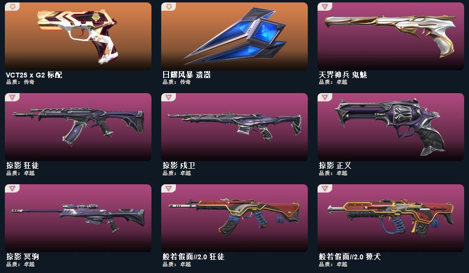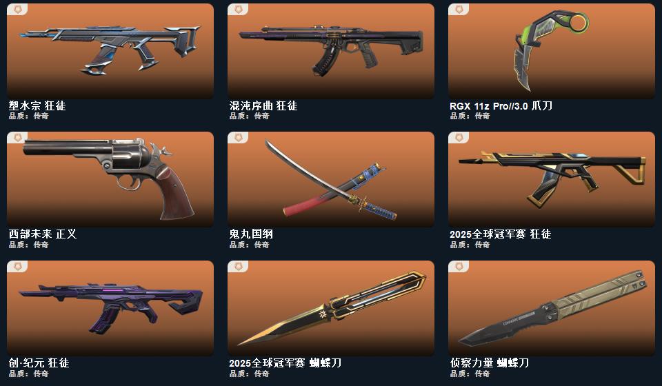 2025全球冠军赛套装,西部未来套装,掠影套装,般若假面//2.0套装,碎心裂刃,2025全球冠军赛 蝴蝶刀,日耀风暴 遗器,神圣领域 战刀,未来开拓者,鬼丸国纲,侦察力量 蝴蝶刀,影刃,超限闪存 匕首,RGX 11z Pro//3.0 爪刀