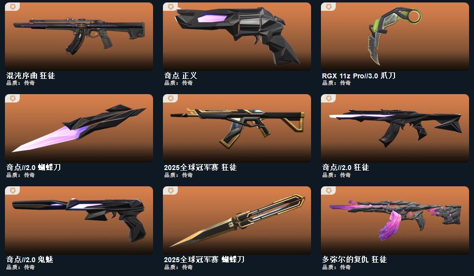 2025全球冠军赛套装,奇点//2.0套装,2025全球冠军赛 蝴蝶刀,超限闪存 匕首,奇点//2.0 蝴蝶刀,超能偶像 应援棒,RGX 11z Pro//3.0 爪刀,创·纪元 莽侠,神中神罚 幻影