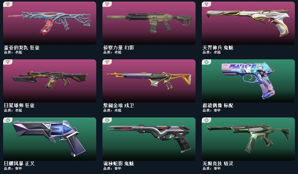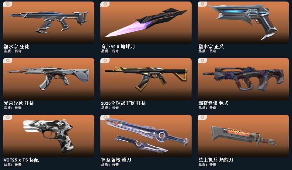 神圣领域 战刀,荒土机兵 热能刀,奇点//2.0 蝴蝶刀,蒙太奇 狂怒,无限竞技 骇灵,月球哨兵 雄鹿,2025全球冠军赛 狂徒,星云暗涌 冥驹,神圣领域 战神