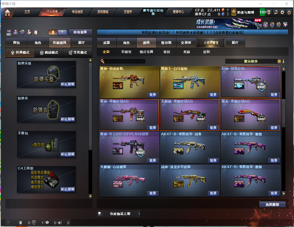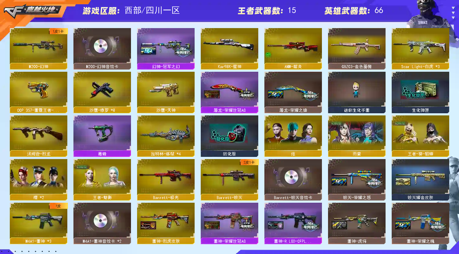 【毁灭三件套】【毁灭三件套】星神/5黑骑士挑战吸血 【步枪】火麒麟/雷神/黑骑士/死神/超新星/朱雀/白虎/无影神兵利器/QBZ金色蔷薇/王者之心/王者之势/ 【狙击枪】毁灭/激光/裁决/幻神/星神/王者之决/ 【机枪】炼狱/ 【冲锋枪】烈龙/ 【散弹枪】 【挑战强化武器】黑骑士x5/超新星/白虎/王者之势/雷霆王者/裁决/王者之决/炼狱/烈龙/炫金超新星/ 【生化武器】死神/朱雀/QBZ金色蔷薇/裁决/幻神/王者之决/ 【手枪】修罗x6/天神/雷霆王者/ 【刀】屠龙x4/龙啸/麒麟刺/幻灵之锋/王者之啸/王者之击/荣耀世冠龙啸/雷霆王者之锋x2/ 【手雷】幻灵手雷x2/雷霆王者/幻灵手雷x2/雷霆王者闪光弹/幻灵烟雾弹x3/雷霆王者烟雾弹/雷霆闪光弹 【角色】樱/雨棠/炫/王者葵貂蝉/王者魅影/ 【卡】黑骑士卡/幻神卡/火麒麟卡/雷神卡/毁灭卡/ 【皮肤】雷神烈虎/黑骑士白马银枪/幻神冠军之幻/雷神RLGD18冠军/毁灭耀金/火麒麟青羽/火麒麟AGS4冠军典藏/雷神虎将/屠龙荣耀之锋/毁灭荣耀之怒/雷神荣耀之魄/火麒麟平天大圣;QBZ03-金色蔷薇,M200-幻神,Scar Light-白虎,Kar98K-星神,