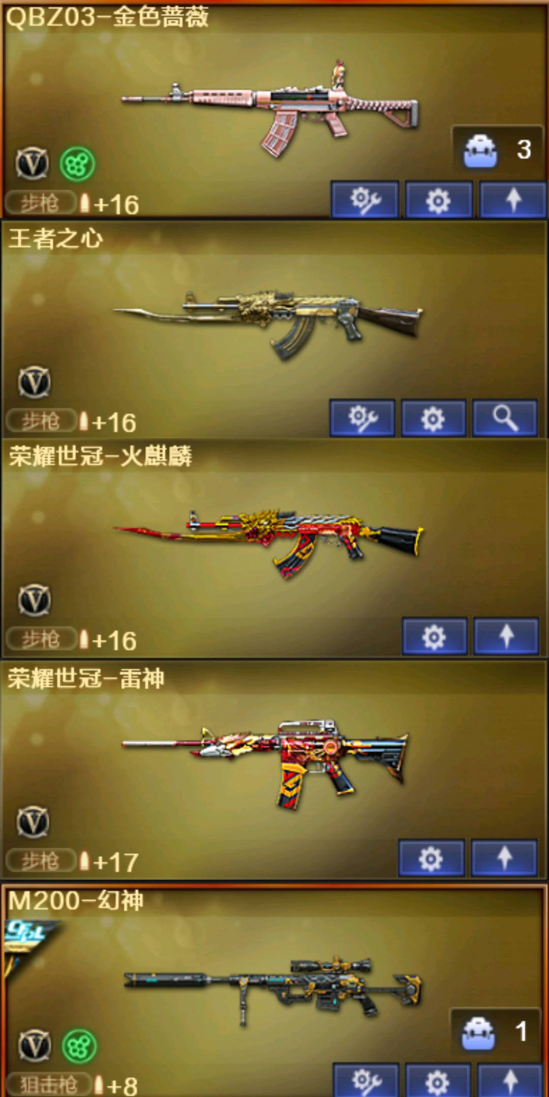 111111;荣耀世冠-柯尔特,RPK-盘龙,QBZ03-金色蔷薇,M200-幻神,