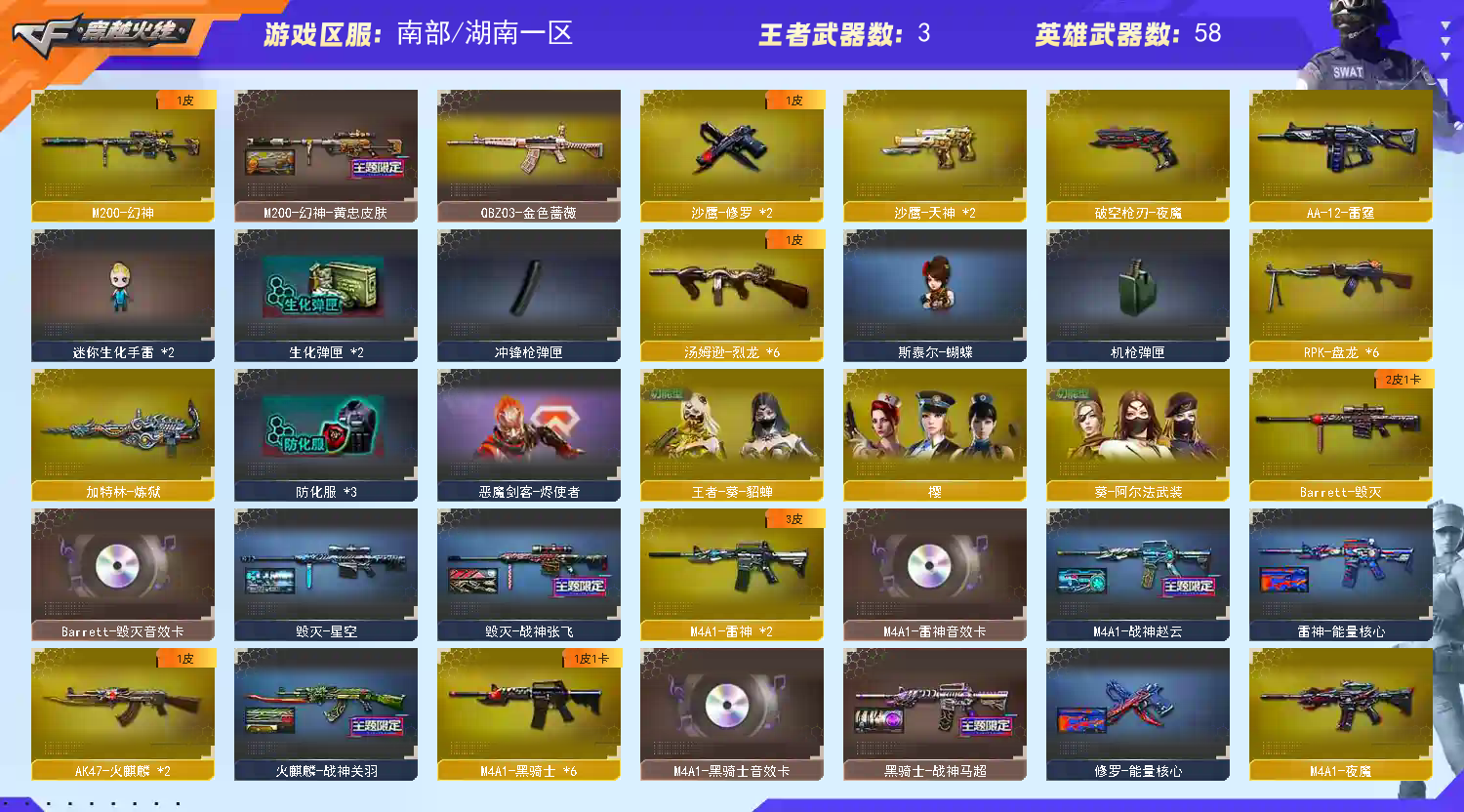 M200-幻神+幻神-黄忠】【QBZ03-金色蔷薇】【生化 6盘龙 炼狱 6烈龙】【Barrett-毁灭+音效卡】【夜魔套】【AK47-火麒麟】【M4A1-雷神+音效卡】【6黑骑士+音效卡+黑骑士-马超】【王者之魄 王者之城】【黑武士 超新星 hk417-朱雀 黑鲨 烈火】【4手枪 修罗 天神*2 】【4近战 屠龙 龙啸 擎天】【手雷 夜魔雷】【四防 王者葵貂蝉;RPK-盘龙,QBZ03-金色蔷薇,M200-幻神,