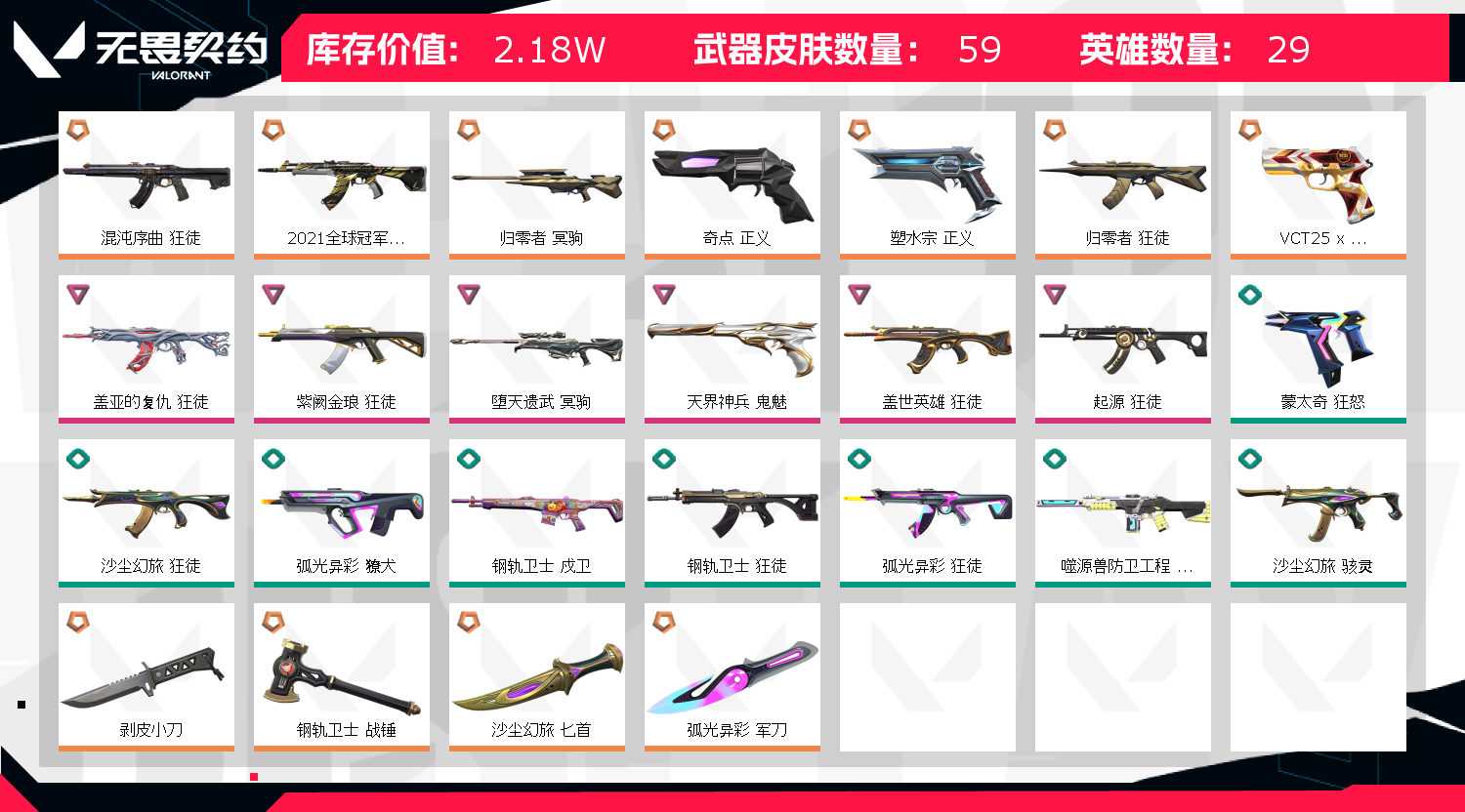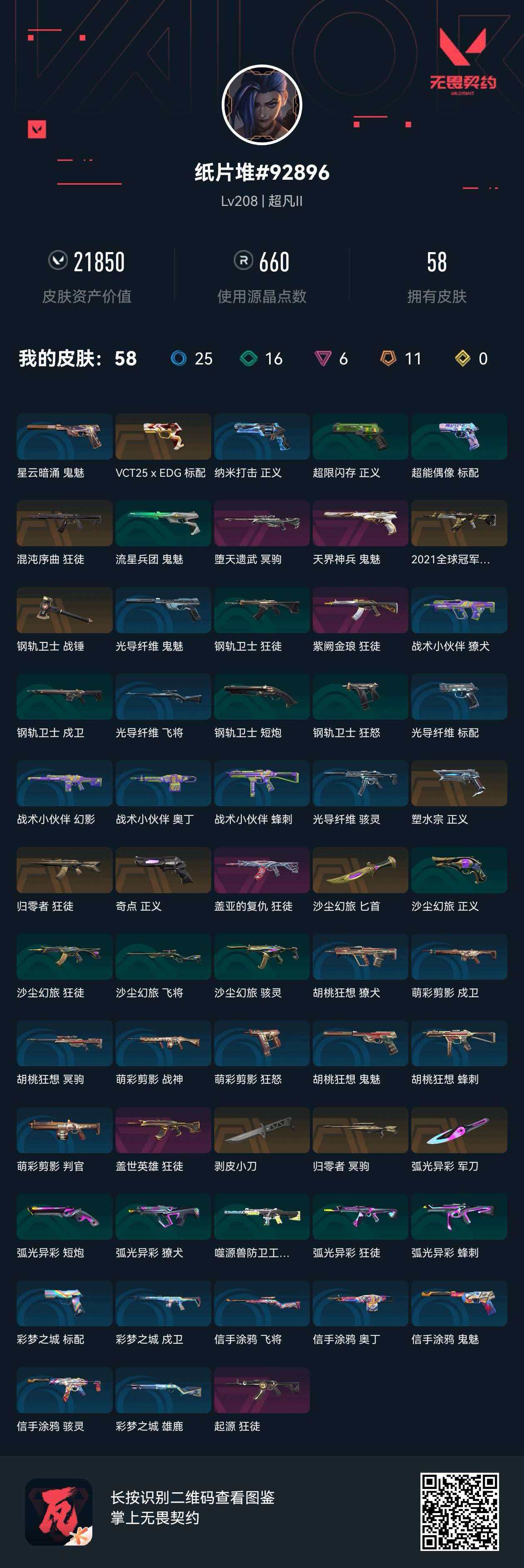 208级 21850皮肤总价值,4刀皮,54枪皮(热门枪皮7狂徒2正义1鬼魅2冥驹1标配);【刀皮】:近战武器-剥皮小刀,近战武器-沙尘幻旅匕首,近战武器-钢轨卫士战锤,近战武器-弧光异彩军刀;【枪皮】:标配-VCT25xEDG,狂徒-2021全球冠军赛,正义-奇点,正义-塑水宗,狂徒-归零者,狂徒-混沌序曲,冥驹-归零者,鬼魅-天界神兵,狂徒-盖亚的复仇,狂徒-紫阙金琅,狂徒-盖世英雄,狂徒-起源,冥驹-堕天遗武,正义-沙尘幻旅,短炮-钢轨卫士,短炮-弧光异彩,狂怒-钢轨卫士,骇灵-沙尘幻旅,蜂刺-弧光异彩,狂徒-钢轨卫士,狂徒-弧光异彩,狂徒-沙尘幻旅,幻影-噬源兽防卫工程,戍卫-钢轨卫士,獠犬-弧光异彩,飞将-沙尘幻旅,标配-光导纤维,标配-彩梦之城,鬼魅-光导纤维,鬼魅-胡桃狂想,鬼魅-信手涂鸦,狂怒-萌彩剪影,骇灵-光导纤维,骇灵-信手涂鸦,蜂刺-战术小伙伴,蜂刺-胡桃狂想,判官-萌彩剪影,雄鹿-彩梦之城,幻影-战术小伙伴,戍卫-彩梦之城,戍卫-萌彩剪影,獠犬-战术小伙伴,獠犬-胡桃狂想,冥驹-胡桃狂想,飞将-光导纤维,飞将-信手涂鸦,奥丁-战术小伙伴,奥丁-信手涂鸦,战神-萌彩剪影,正义-超限闪存,鬼魅-流星兵团,标配-超能偶像,正义-纳米鬼魅-星云暗涌;