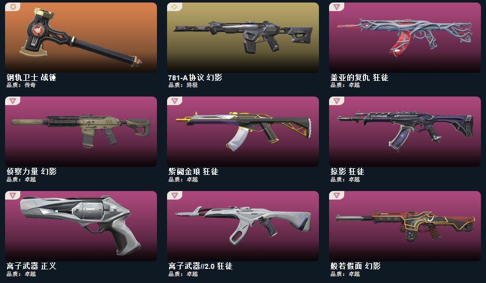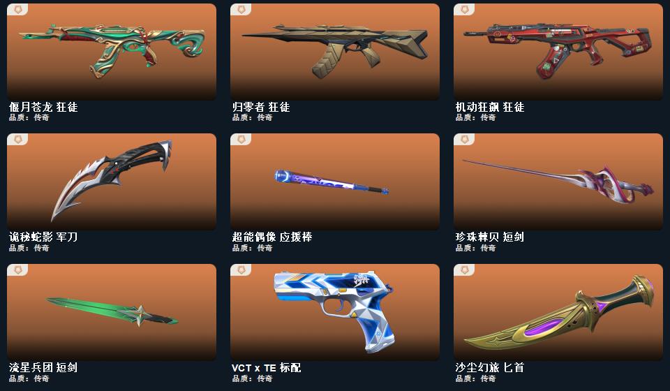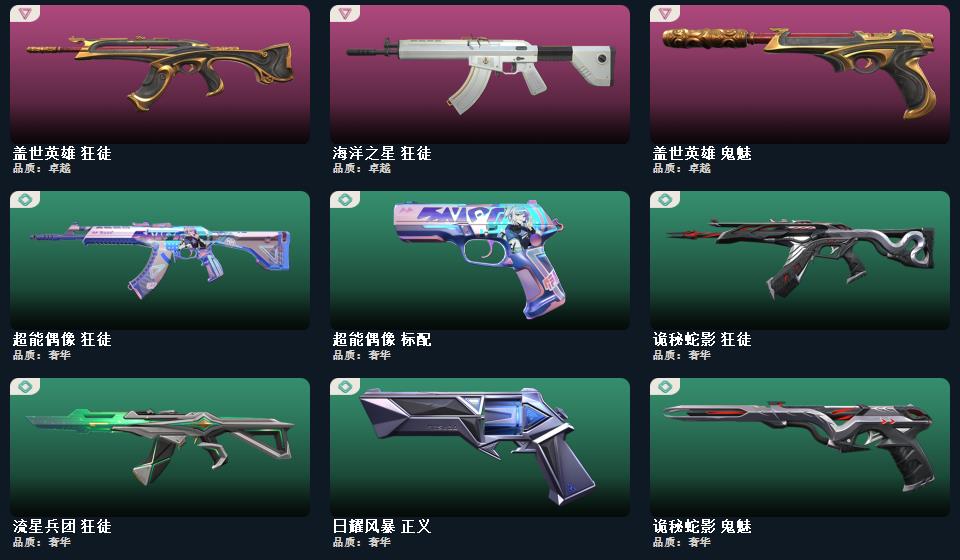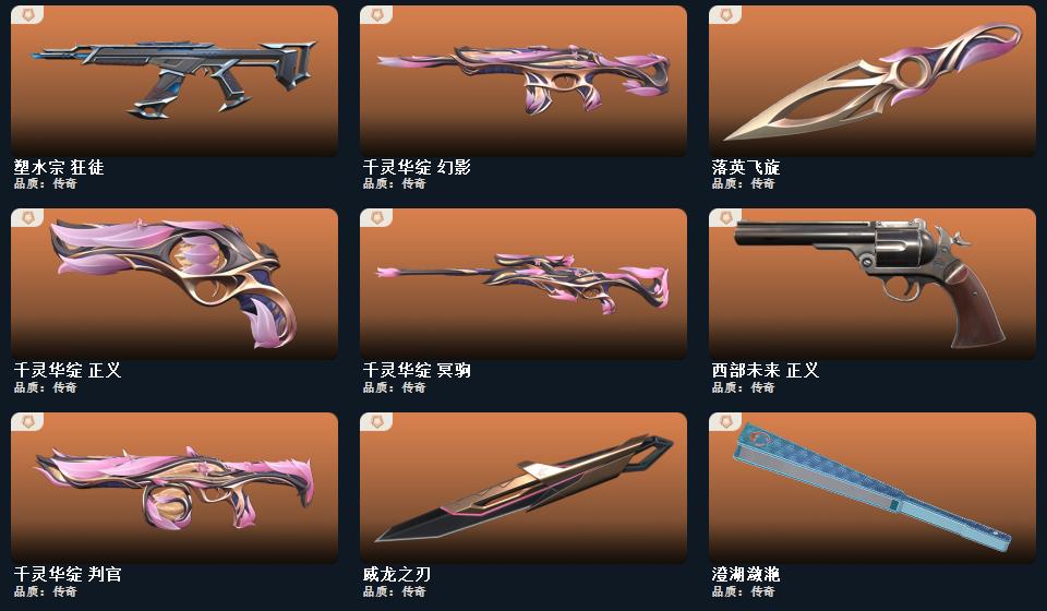 千灵华绽套装,诡秘蛇影 军刀,超能偶像 应援棒,流星兵团 短剑,落英飞旋,珍珠棘贝 短剑,威龙之刃,钢轨卫士 战锤,澄湖潋滟,沙尘幻旅 匕首,般若假面 幻影,诡秘蛇影 莽侠,日耀风暴 正义