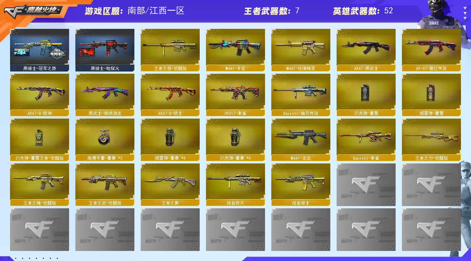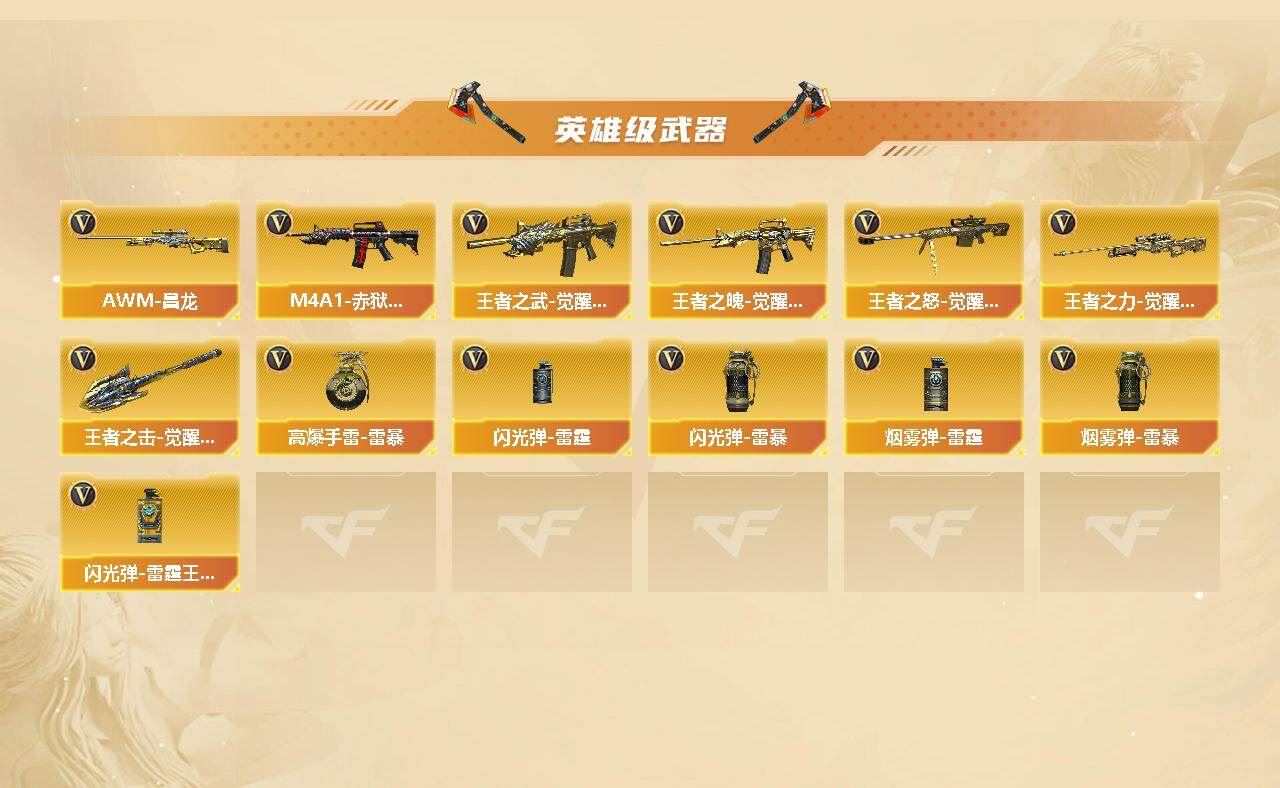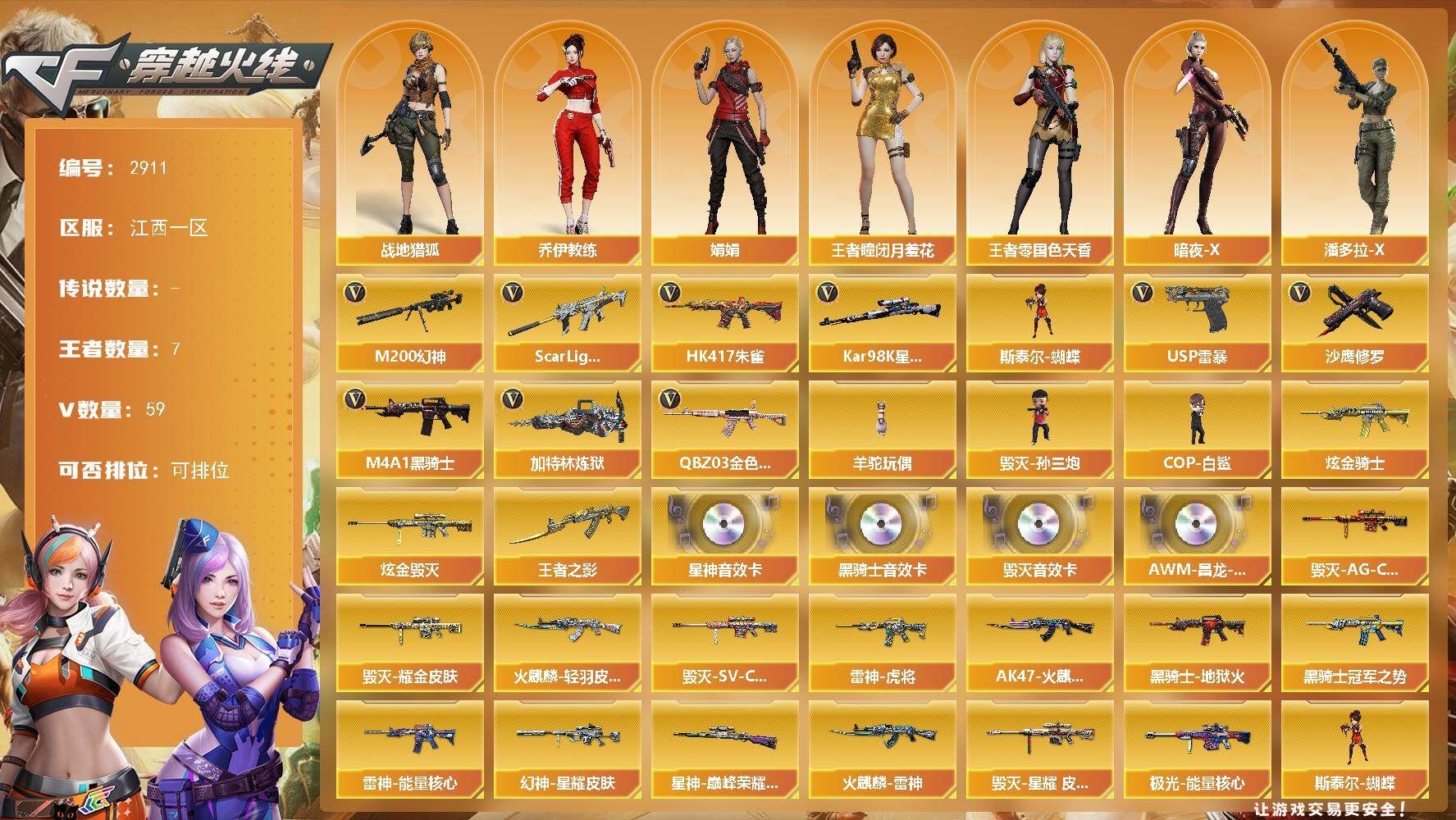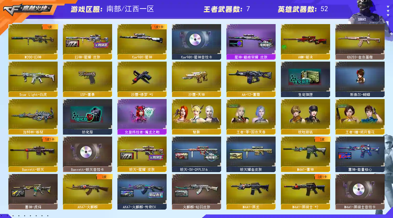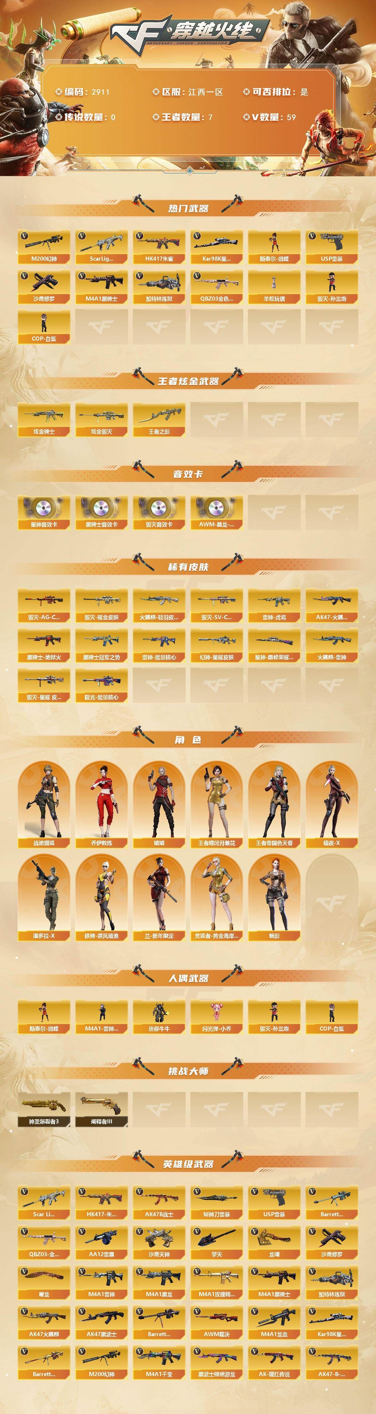 【热门武器】:QBZ03-金色蔷薇,Scar Light-白虎,HK417-朱雀,M200-幻神,Kar98K-星神,M4A1-黑骑士*2,加特林-炼狱,斯泰尔-蝴蝶,羊驼玩偶*2,毁灭-孙三炮,COP-白鲨,USP-雷暴,沙鹰-修罗*5【王者炫金武器】:王者之影,炫金骑士,炫金毁灭【音效卡】:M4A1-黑骑士音效卡,Barrett-毁灭音效卡,Kar98K-星神音效卡,AWM-昌龙-怀旧音效卡【皮肤】:幻神-星耀 皮肤,星神-巅峰荣耀 皮肤,雷神-能量核心,雷神-虎将,火麒麟-雷神,AK47-火麒麟-传奇EVEN,火麒麟-轻羽皮肤,毁灭耀金皮肤,毁灭-AG-CFPLS15冠军,毁灭-SV-CFPLS16冠军,毁灭-星耀 皮肤,黑骑士-冠军之势,黑骑士-地狱火,极光-能量核心*2【角色】:魅影,战地猎狐,王者-瞳-闭月羞花,4防王者-零-国色天香,乔伊教练,暗夜-X,娟娟,兰-新年限定,灵狐者-黄金海岸,潘多拉-X,铁骑-乘风破浪【人偶武器】:COP-白鲨,毁灭-孙三炮,M4A1-雷神-精英刀锋,斯泰尔-蝴蝶,迷你牛牛,闪光弹-小乔【挑战大师】:神圣爆裂者III*2,阐释者III【英雄级武器】:M4A1-千变,AK47-火麒麟,M4A1-黑龙,M4A1-雷神,M4A1-黑骑士*2,AK47-黑武士,M4A1-龙血,HK417-朱雀,Scar Light-白虎,黑武士-锦绣游龙,M4A1-玫瑰精灵,QBZ03-金色蔷薇,王者之武-觉醒版,王者之魄-觉醒版,AK-47-猩红传说,AK47-B-战神,AK47-B-战士,Barrett-毁灭,AWM-裁决,M200-幻神,Barrett-朱雀,Kar98K-星神,王者之怒-觉醒版,王者之力-觉醒版,Barrett-暗月传说,加特林-炼狱,AA-12-雷霆,沙鹰-修罗*5,沙鹰-天神,USP-雷暴,屠龙*3,龙啸,擎天,斩神刀-雷暴,王者之击-觉醒版,高爆手雷-雷暴*5,闪光弹-雷霆,闪光弹-雷暴*4,闪光弹-雷霆王者-觉醒版,烟雾弹-雷霆,烟雾弹-雷暴*4,M4A1-赤狱骑士,AWM-昌龙【源级武器】:源-千变*2,源·火麒麟*2,火麒麟-雷神,御·黑龙-龙太子,源·雷神*2,魂·雷神-诺拉,魂·雷神-维纳斯,M4A1-十二生肖·龙-雷神,雷神-赛博朋克,御·雷神-葫芦兄弟,御·黑骑士·哪吒闹海,御·超新星-圣诞,源·青龙,灵·HK417-朱雀-甜蜜火力,魂·QBZ03-金色蔷薇-蛇姬,QBZ03-文殊坊,魂·9A91·烈火-电子连击,源·天龙,御·毁灭-葫芦兄弟,源·炼狱,御·炼狱-女娲,源·天神,源-擎天,魂·麒麟刺-月【道具】:CFS限定背包,EP战队炫彩背包,XROCK炫彩背包,炫彩背包,超级背包,女皇终结者-魔龙之吻,救世主-黑桃战神,变异宝贝,生化弹匣,夺命之镰,防化服,巅峰赛先锋-金色流光,流光-鎏金之域,枪王排位28赛季金色流光,枪王排位29赛季金色流光,C4-再燃火线,防弹头盔*3,防弹衣*3,C4工具钳*2,手雷包【特殊枪械】:蝴蝶斯泰尔+0烈龙,1白虎,2黑骑士,1炼狱,1蝴蝶斯泰尔,;USP-雷暴,QBZ03-金色蔷薇,M200-幻神,Scar Light-白虎,Kar98K-星神,