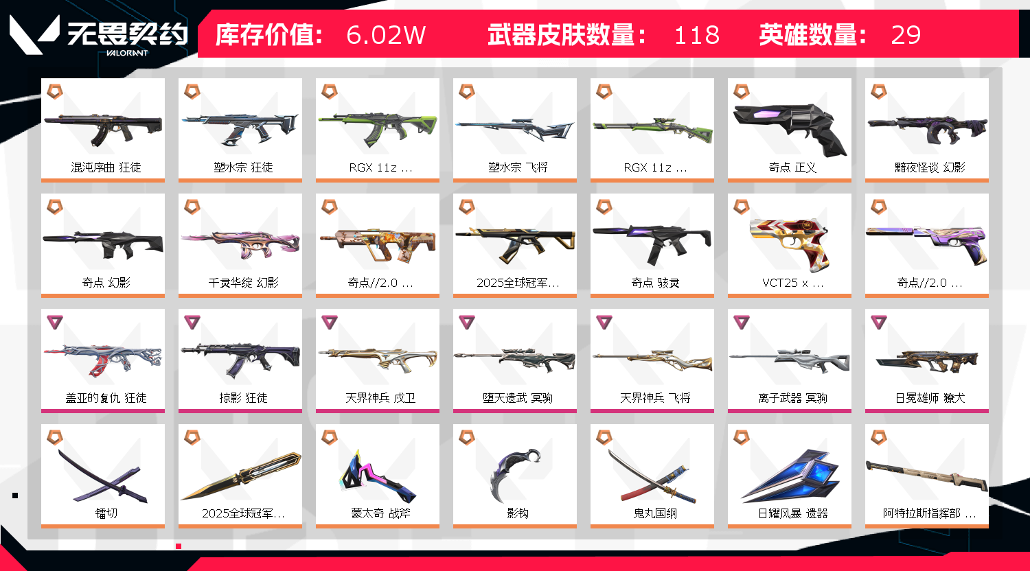 英雄28 武器皮肤数量118;镭切,盖亚的复仇 狂徒,掠影 狂徒,RGX 11z Pro 狂徒,天界神兵 戍卫,混沌序曲 狂徒,塑水宗 狂徒,