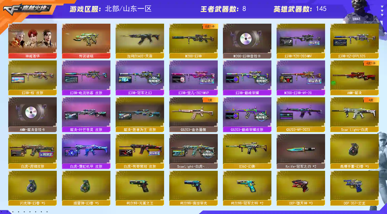 首页 > 租号大厅 > 穿越火线 > 北部/山东一区 > 1️⃣莲华+5幻兽⚡幻神8皮“权”yzk宠儿KZ带音效⚡裁决三件套⚡天袭幻影白虎cop冠特usp