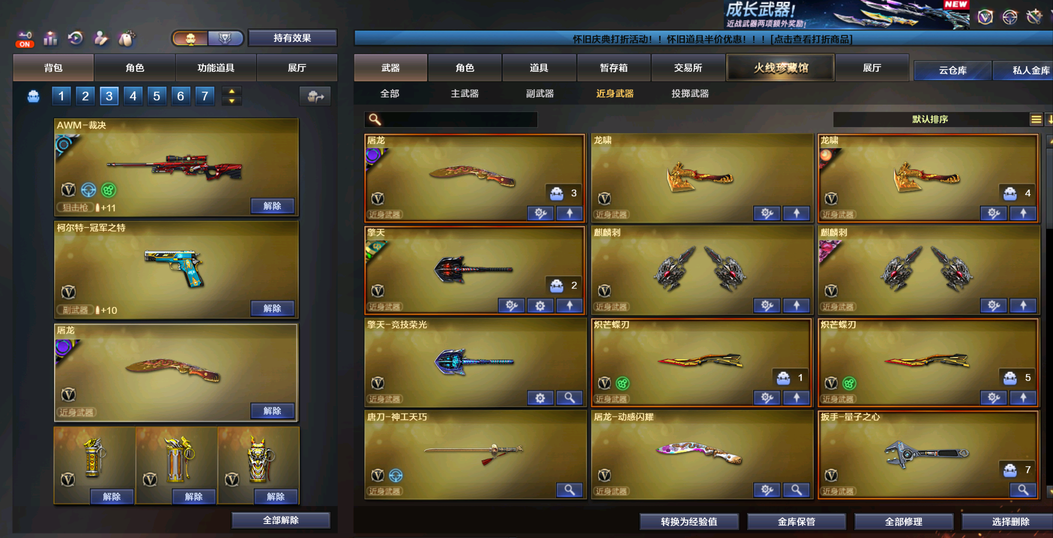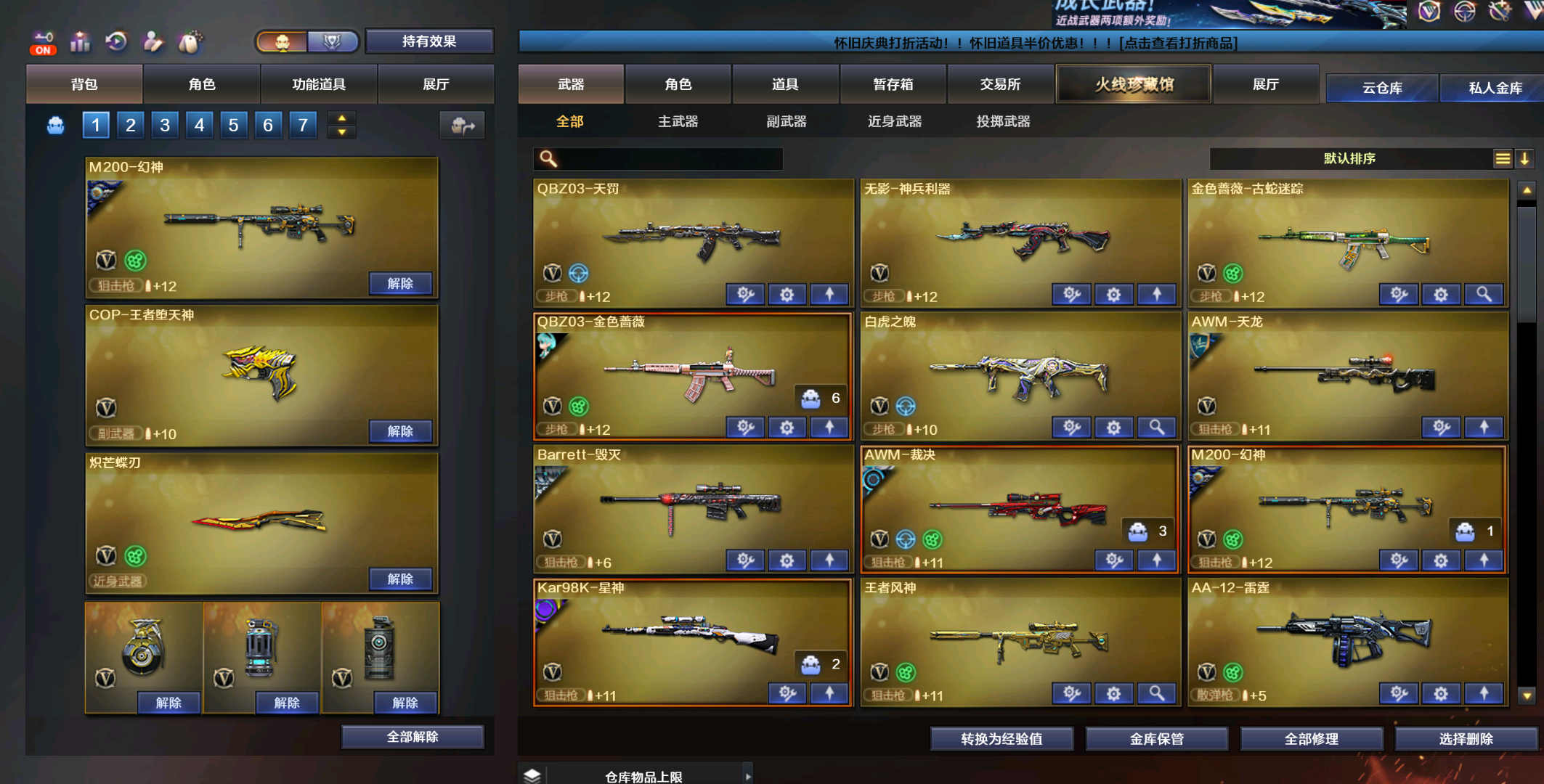 幻神三件套,裁决三件套,白虎三件套,七套手雷,七副武器,usp柯尔特cop都有,近战武器齐全,基础道具齐全,可排位可巅峰,禁止开挂;柯尔特-冠军之特,炽芒蝶刃,传说艾莉莎,QBZ03-金色蔷薇,M200-幻神,Scar Light-白虎,Kar98K-星神,