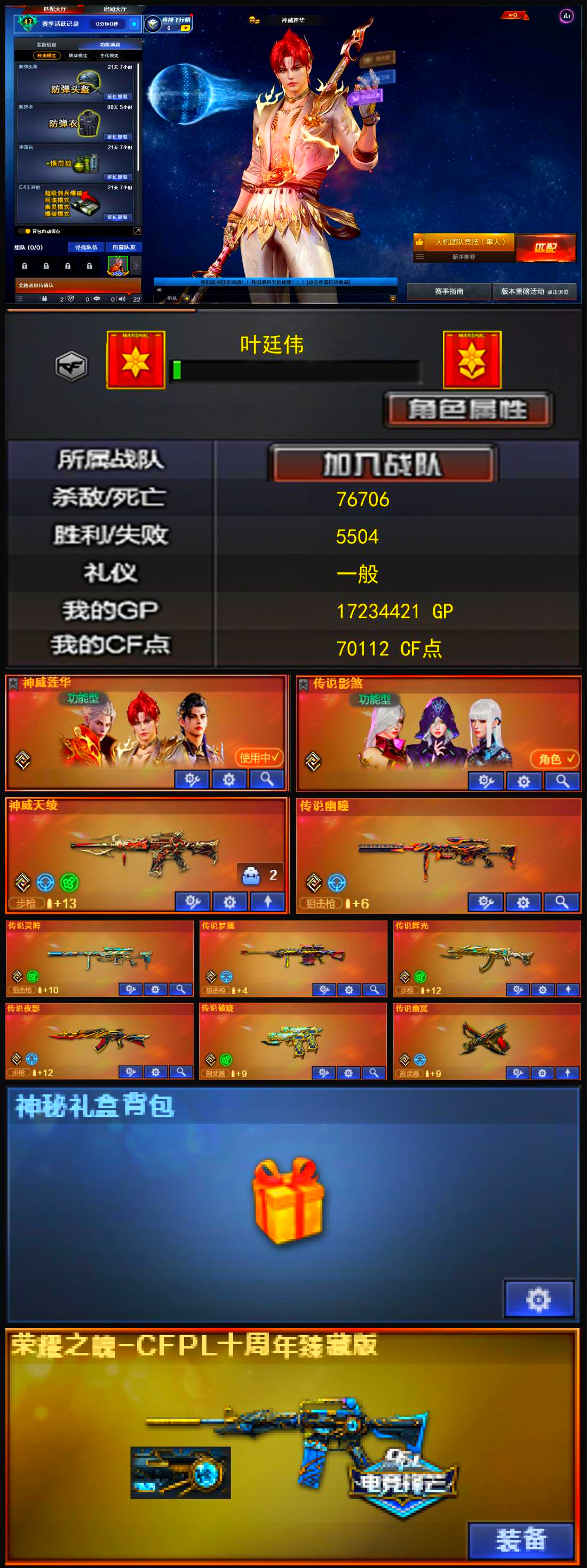神威莲华传说影煞金狮子六盘六烈幻神20皮三件套星神三件套 裁决三件套50把副武器12把蝴蝶刀氪金天花板大佬专属氪金30w开挂必起诉;USP-雷暴,柯尔特-无冕之王,荣耀世冠-柯尔特,柯尔特-荣耀世冠白鲨2023,传说幽冥,柯尔特-冠军之特,炽芒蝶刃,