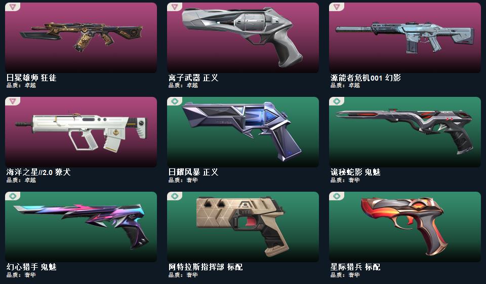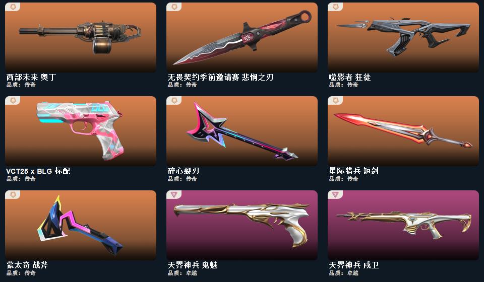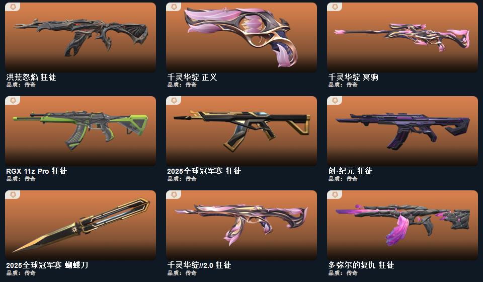 2025全球冠军赛套装,无畏契约季前邀请赛套装,蒙太奇 战斧,无畏契约季前邀请赛 悲悯之刃,碎心裂刃,星际猎兵 短剑,2025全球冠军赛 蝴蝶刀,蒙太奇 狂怒,超集系统 狂徒,风暴之子 冥驹,蒙太奇 战神,蒙太奇 骇灵