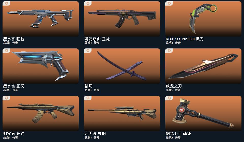 耀鳞威龙套装,RGX 11z Pro//3.0 爪刀,镭切,钢轨卫士 战锤,威龙之刃,幻心猎手 鬼魅,阿特拉斯指挥部 骇灵,混沌序曲 狂徒,阿特拉斯指挥部 莽侠,太空穿梭 判官,太空穿梭 战神