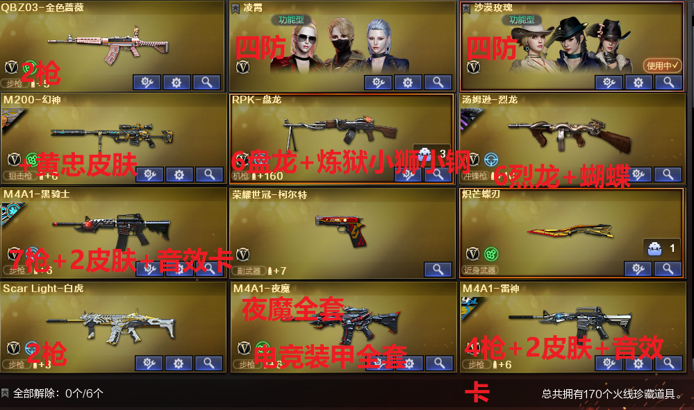 生化挑战号✅7烈龙蝴蝶+6盘龙炼狱小狮+炽芒蝶刃✅世冠柯尔特+幻神黄忠✅7黑骑士带卡✅夜魔电竞装甲套