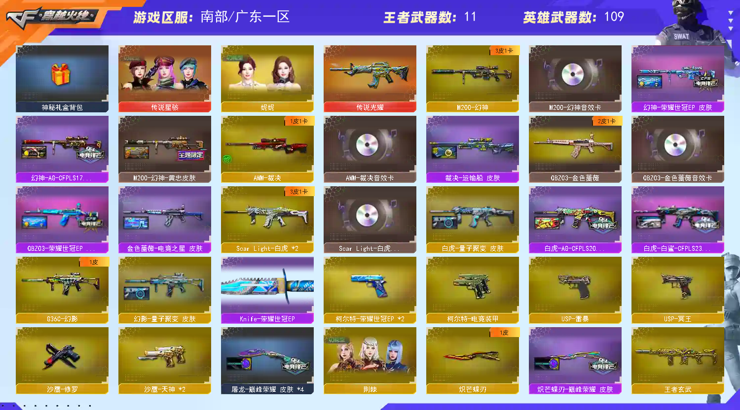 首页 > 租号大厅 > 穿越火线 > 南部/广东一区 > 传说光耀星骇妮妮❤幻神四皮音效裁决qbz白虎幻影三件套❤荣耀世冠ep全套九把高质量副手六烈炽芒碟刃❤