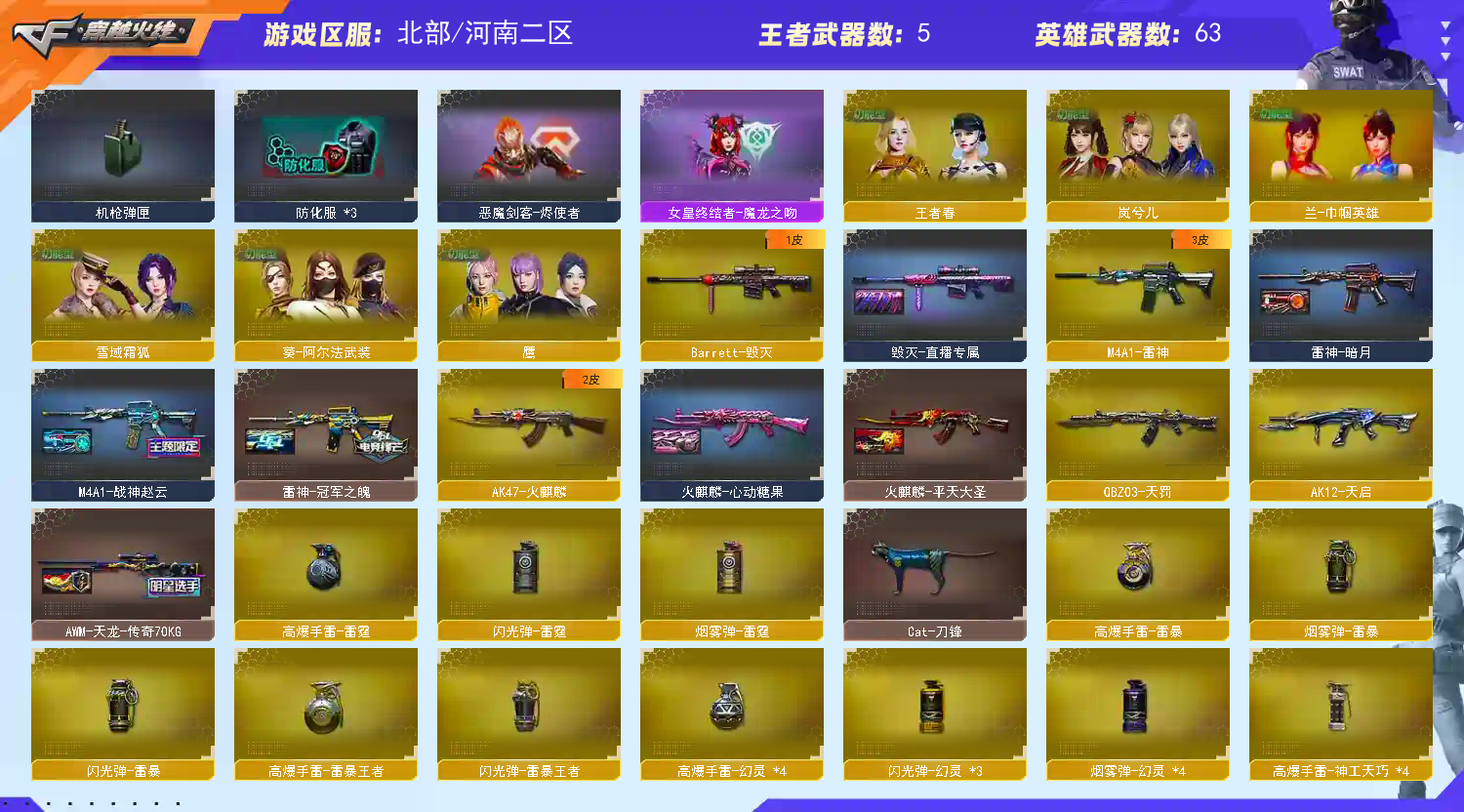 首页 > 租号大厅 > 穿越火线 > 北部/河南二区 > ✨爆破全装✨传说圣谕✨kz 幻神带卡✨裁决三件套✨星神 加利尔 天戎 蔷薇 白虎 幻影多皮带卡✨炽芒