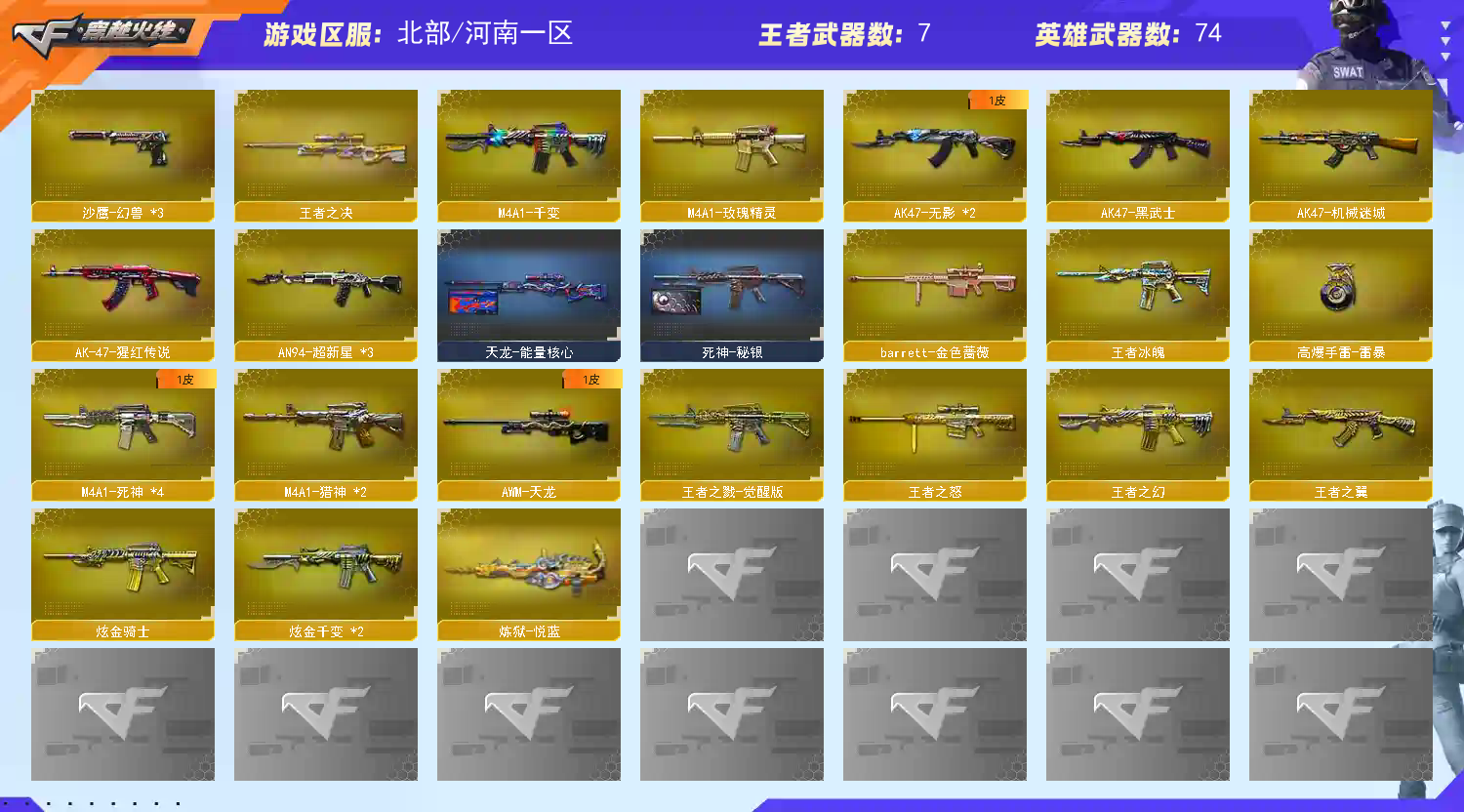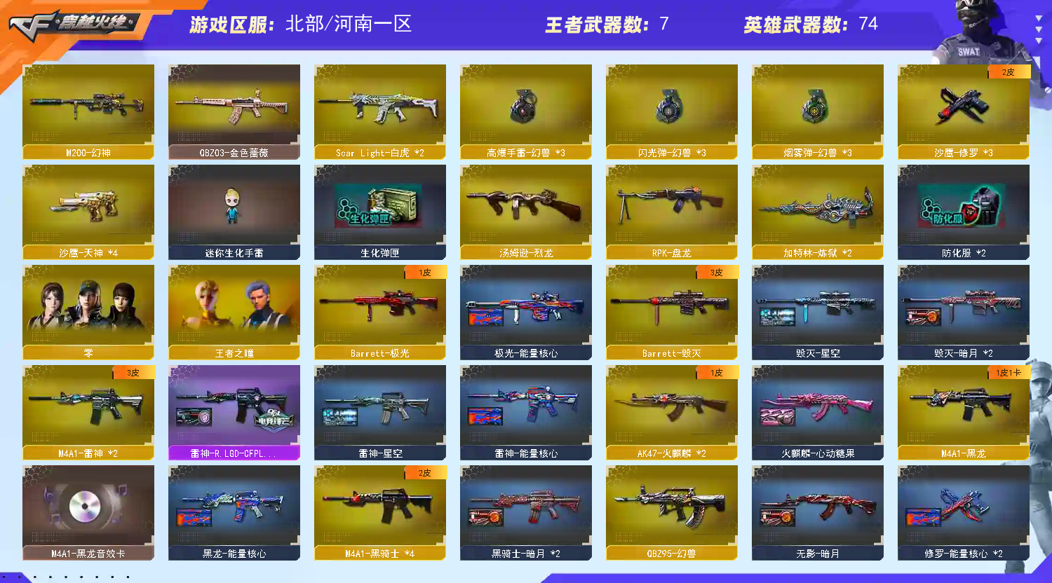 M200-幻神】【QBZ03-金色蔷薇】【生化 盘龙 2炼狱 烈龙 死亡之眼】【Barrett-毁灭】【极光】【幻兽套+幻兽雷*3】【AK47-火麒麟】【黑龙+音效卡】【M4A1-雷神+雷神-lgd18冠军】【4黑骑士 】【王者之戮】【无影 死神 黑武士 超新星 机械迷城 玫瑰精灵】【10手枪 修罗*3 天神*4】【15近战 屠龙*7 龙啸*4 擎天 麒麟刺*2】【角色 零 王者之瞳】【黑龙音效卡;RPK-盘龙,QBZ03-金色蔷薇,M200-幻神,Scar Light-白虎,
