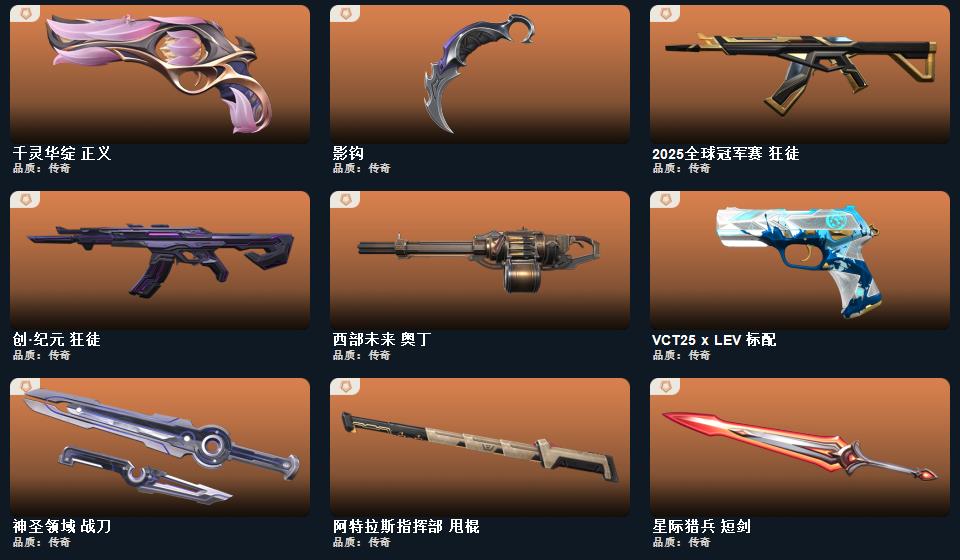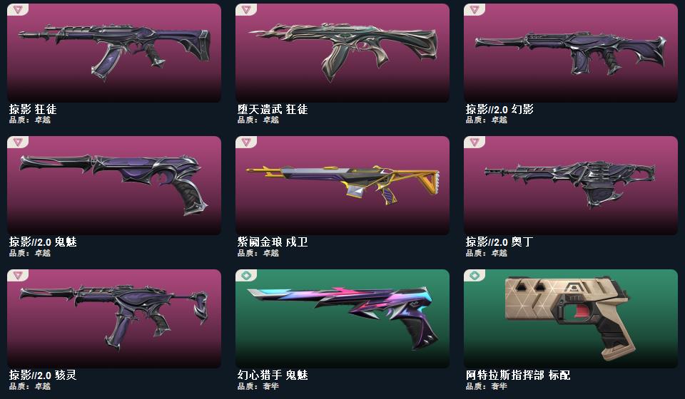 2022全球冠军赛套装,无畏契约季前邀请赛套装,星际猎兵 短剑,阿特拉斯指挥部 甩棍,影钩,神圣领域 战刀,蒙太奇 狂怒,瑰梦艺语 骇灵,星际猎兵 判官,瑰梦艺语 狂徒,光环序列 冥驹,光环序列 战神