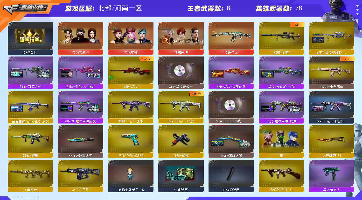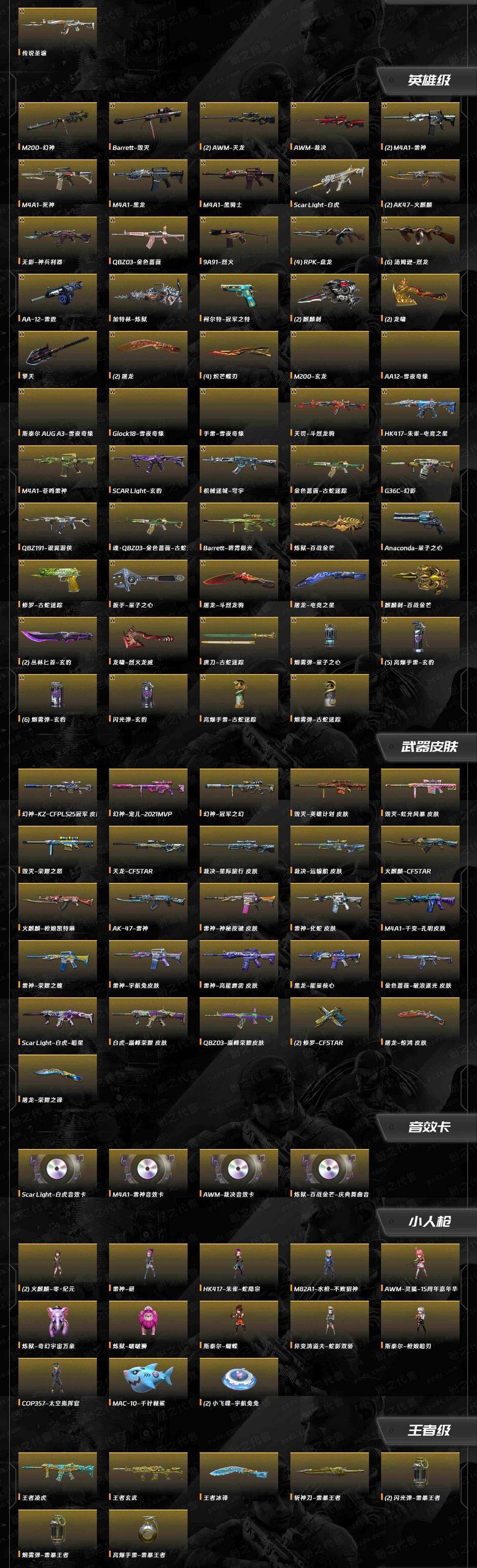 王者武器:炫金天龙;王者之圣;王者冰锋;斩神刀-雷暴王者;王者玄武;烟雾弹-雷暴王者;闪光弹-雷暴王者;高爆手雷-雷暴王者;王者凌虎 英雄武器:M4A1-死神;M4A1-黑骑士;屠龙;龙啸;麒麟刺;AK47-火麒麟;AWM-天龙;Barrett-毁灭;汤姆逊-烈龙;RPK-盘龙;加特林-炼狱;M4A1-雷神;M4A1-黑龙;9A91-烈火;M200-幻神;柯尔特-冠军之特;机械迷城-穹宇;Scar Light-白虎;炽芒蝶刃;无影-神兵利器;AA-12-雷霆;炼狱-奇幻宇宙万象;QBZ03-金色蔷薇;G36C-幻影;擎天;AWM-裁决;传说圣谕; 装饰品:Scar Light-白虎-暗星;毁灭-英雄计划 皮肤;雷神-神秘按键 皮肤;屠龙-荣耀之锋;雷神-荣耀之魄;毁灭-荣耀之怒;击杀图标-16周年限定;幻神-冠军之幻;裁决-运输船 ;白虎-巅峰荣耀;魅影玩偶; 角色:神威莲华;传说艾莉莎;传说星骇;隼; 道具:M4A1-雷神音效卡;Scar Light-白虎音效卡;绿色巨人;AWM-裁决音效卡 传说武器:传说圣谕 幻神武器:幻神-冠军之幻;幻神-宠儿-2021MVP;M200-幻神;柯尔特-冠军之特,炽芒蝶刃,Knife-冠军之刃,传说星骇,隼,传说艾莉莎,RPK-盘龙,
