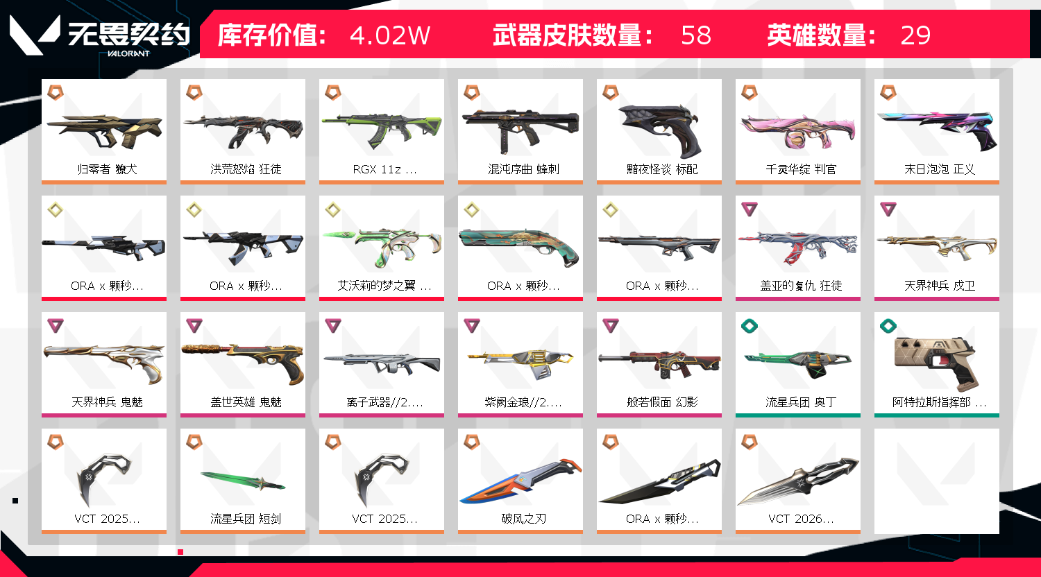 首页 > 租号大厅 > 无畏契约-wegame > wegame/wegame > 无畏契约:44皮/全英雄/可打排位/铂金1/25爪刀/26篆刀/颗秒全套/详细看图片