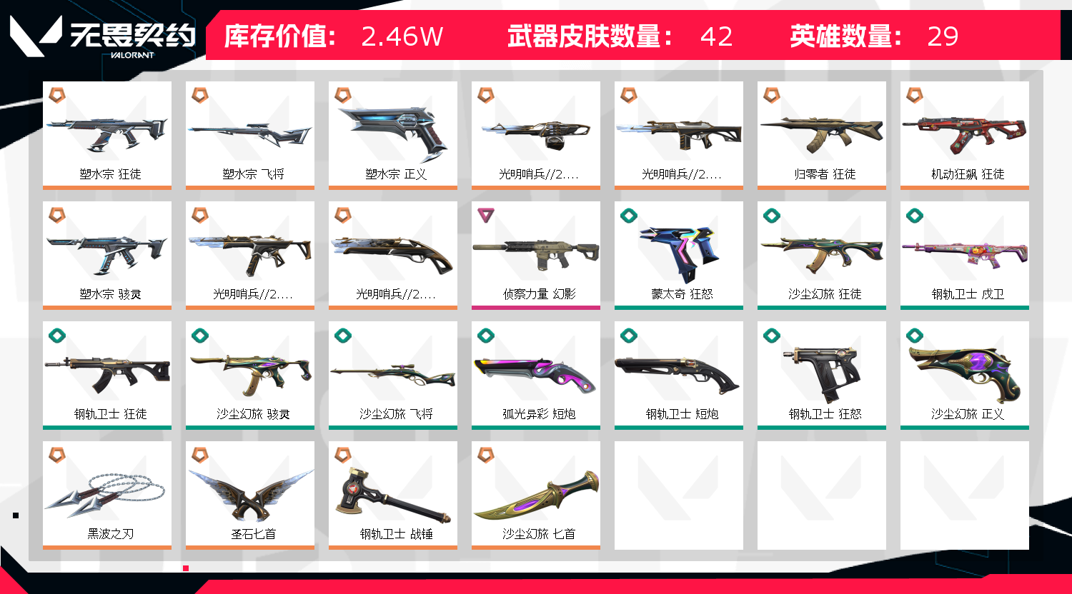 允许 英雄28 武器皮肤数量41;黑波之刃,侦察力量 幻影,塑水宗 狂徒,塑水宗 飞将,塑水宗 正义,