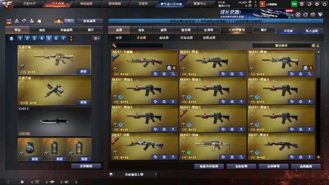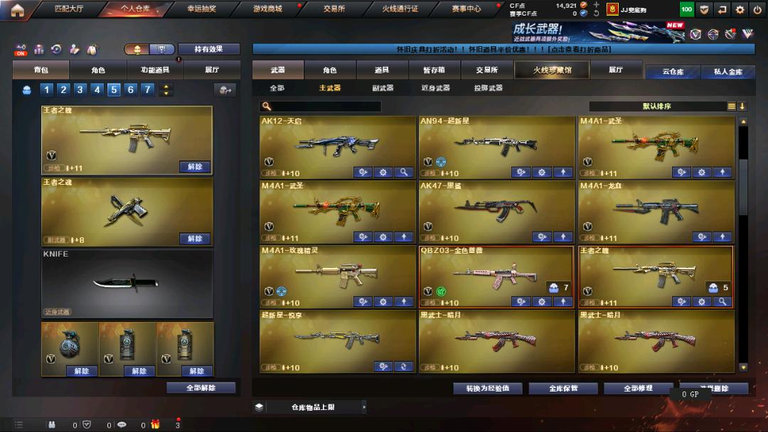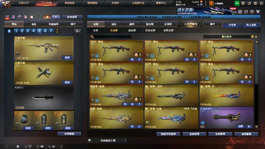 生化+爆破全装王者之魄、雷霆套装、6修罗6屠龙6烈龙6黑骑士6盘龙炼狱加特林;RPK-盘龙,QBZ03-金色蔷薇,