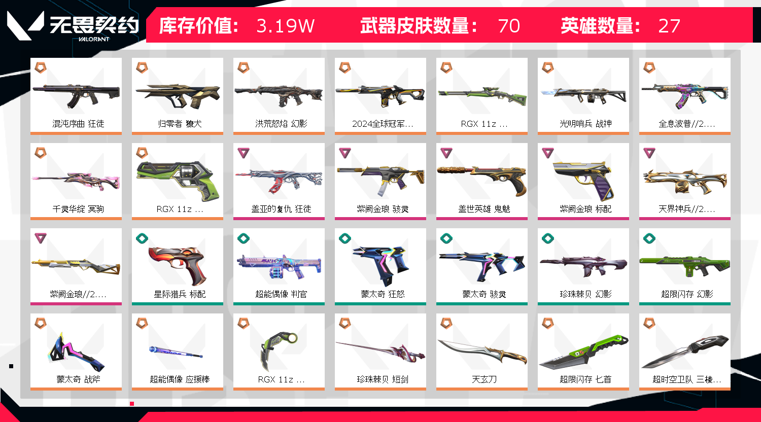 炸鱼小号;归零者 獠犬,盖亚的复仇 狂徒,洪荒怒焰 幻影,混沌序曲 狂徒,2024全球冠军赛 幻影,紫阙金琅 骇灵,RGX 11z Pro//3.0 莽侠,