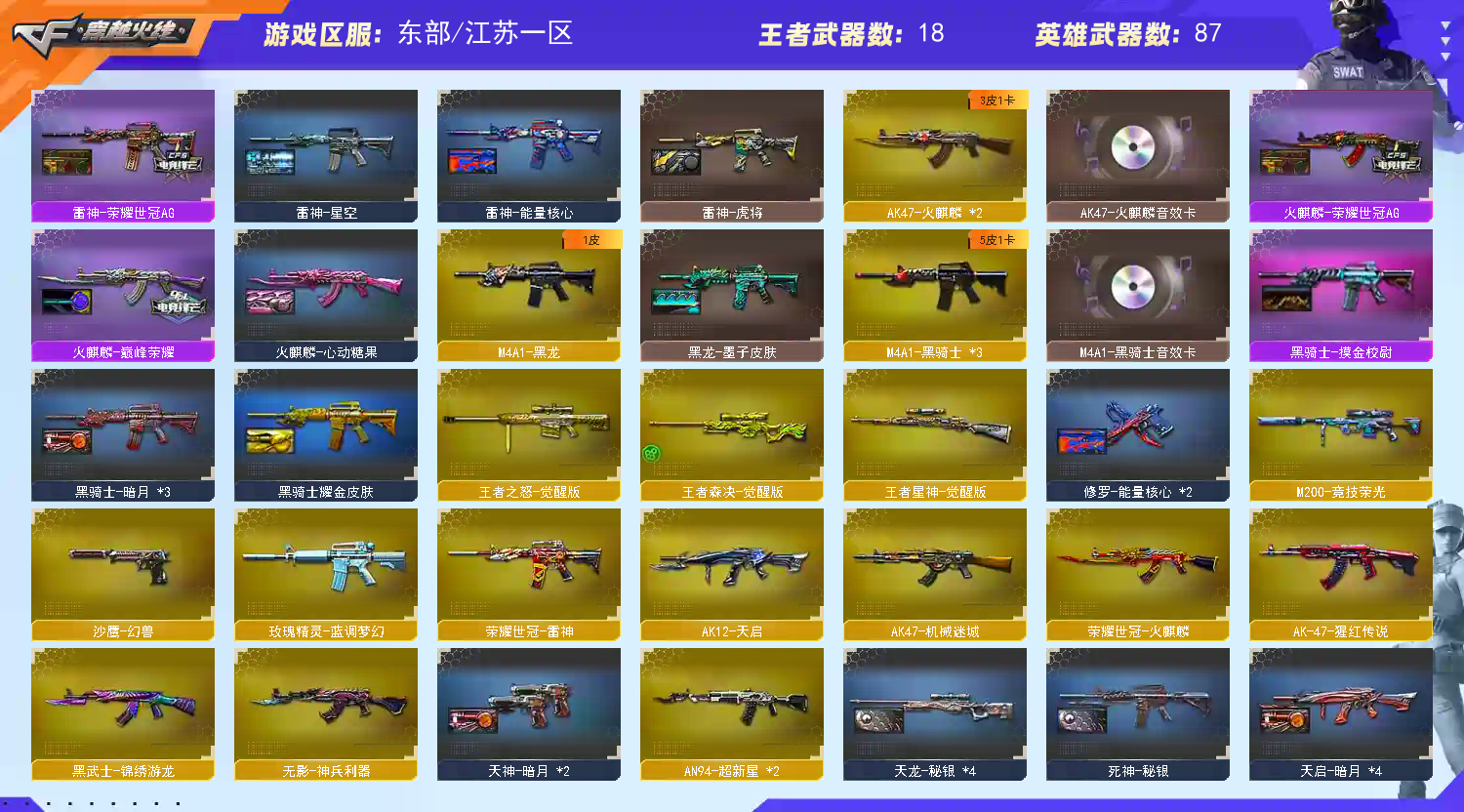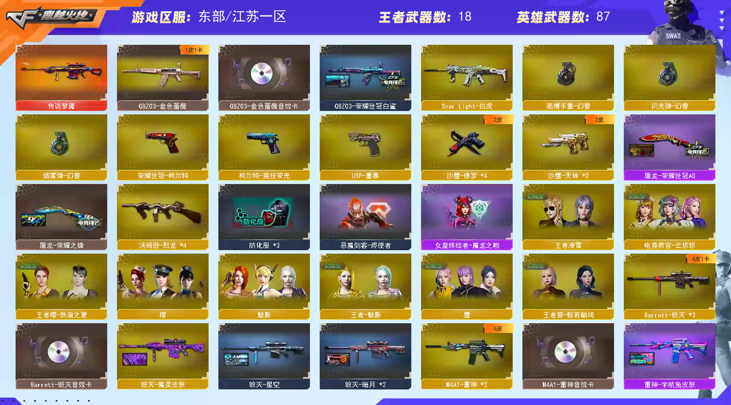 【竞技荣光套+云悠悠+usp雷暴】【幻兽雷】【王者星神】【传说梦魇】【ScarLight-白虎】【QBZ03-金色蔷薇+音效卡】【生化 4烈龙 】【Barrett-毁灭+音效卡】【AK47-火麒麟+音效卡+火麒麟-巅峰荣耀+火麒麟-荣耀世冠ag】【黑龙】【M4A1-雷神+音效卡+雷神-荣耀世冠ag】【黑骑士+音效卡】【王者之心 王者之影 王者之势 王者火魄 王者青龙 王者之怒 王者雷怒 王者森决】【死神 天启 超新星 机械迷城 龙血 】【10手枪 修罗*4 天神*2 usp雷暴 荣耀世冠-柯尔特】【17近战 屠龙*4 龙啸*2 擎天 麒麟刺 王者之锋*3 王者之啸 王者玉锋】【手雷 雷霆雷 竞技荣光】【四防 樱 王者魅影 王者葵惊若翩鸿 王者凌霄】【QBZ03-金色蔷薇音效卡 Barrett-毁灭音效卡 M4A1-雷神音效卡 黑骑士音效卡 AK47-火麒麟音效卡】;USP-雷暴,荣耀世冠-柯尔特,电竞教官-云悠悠,QBZ03-金色蔷薇,Scar Light-白虎,