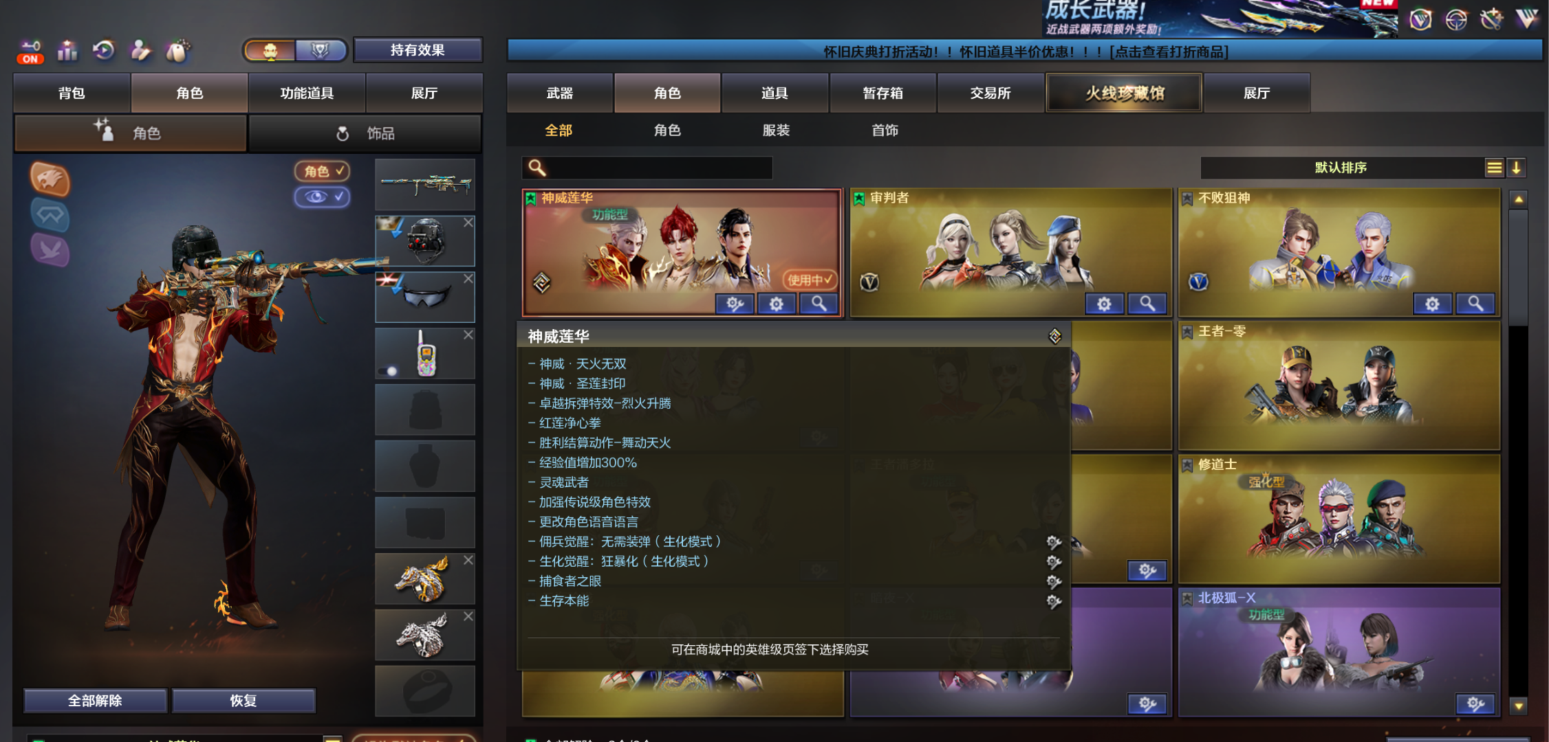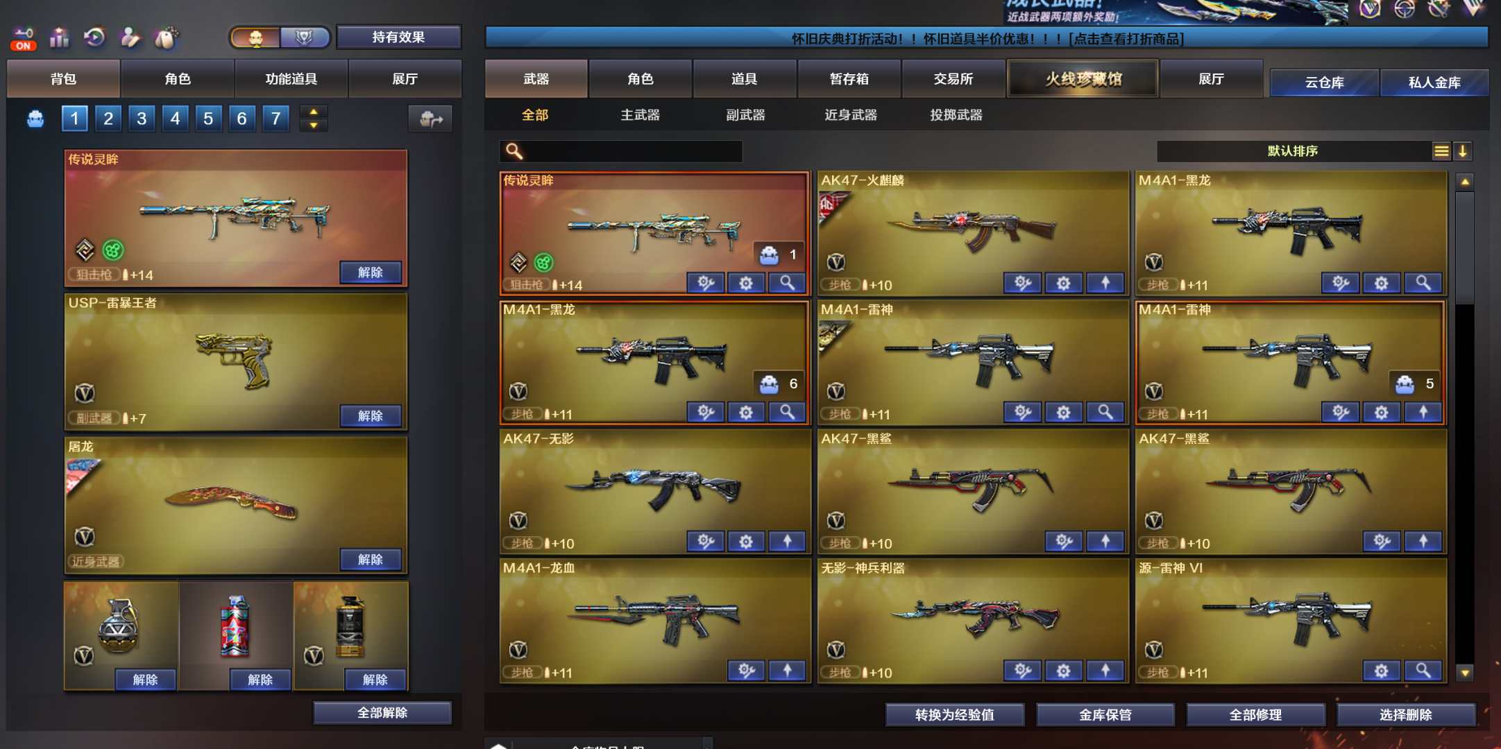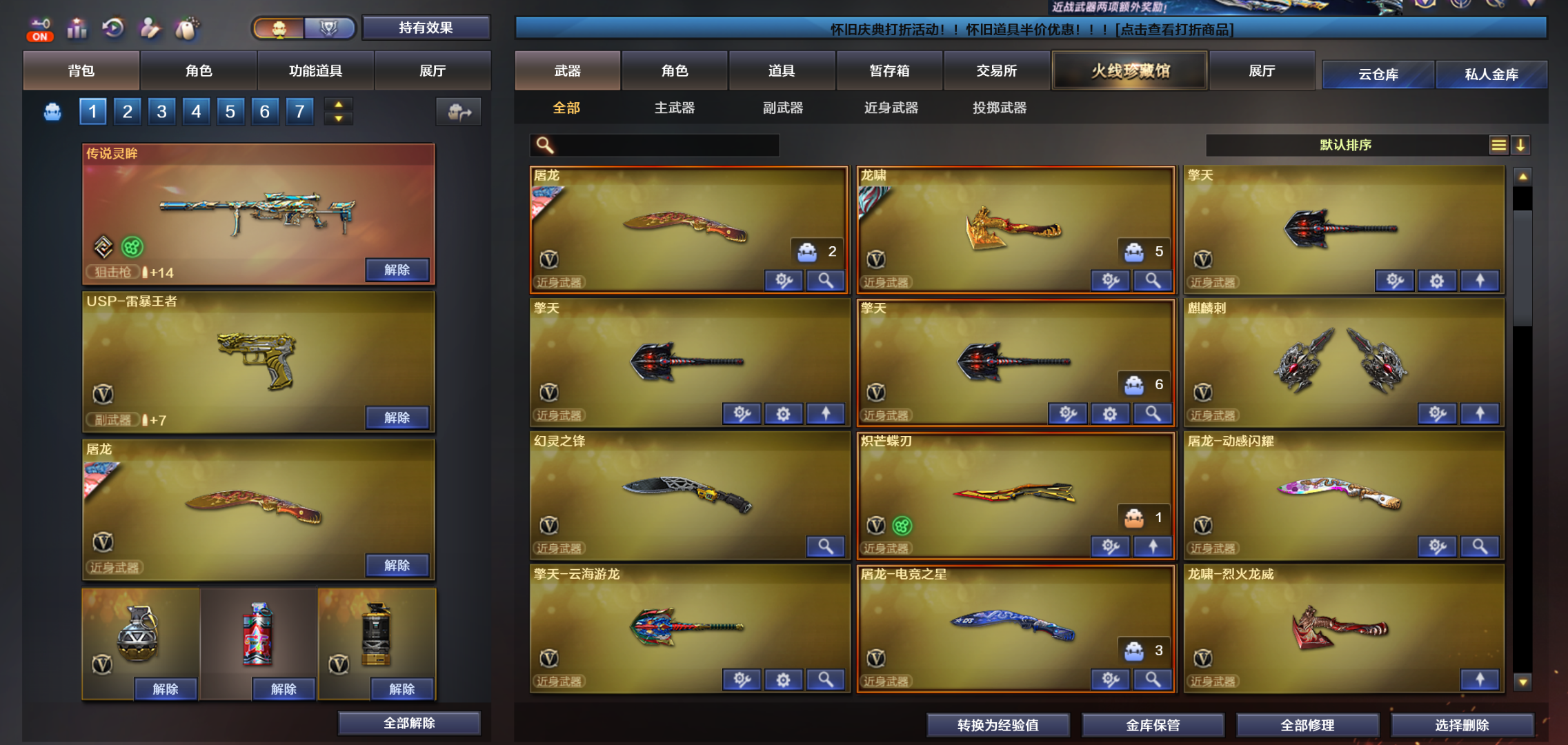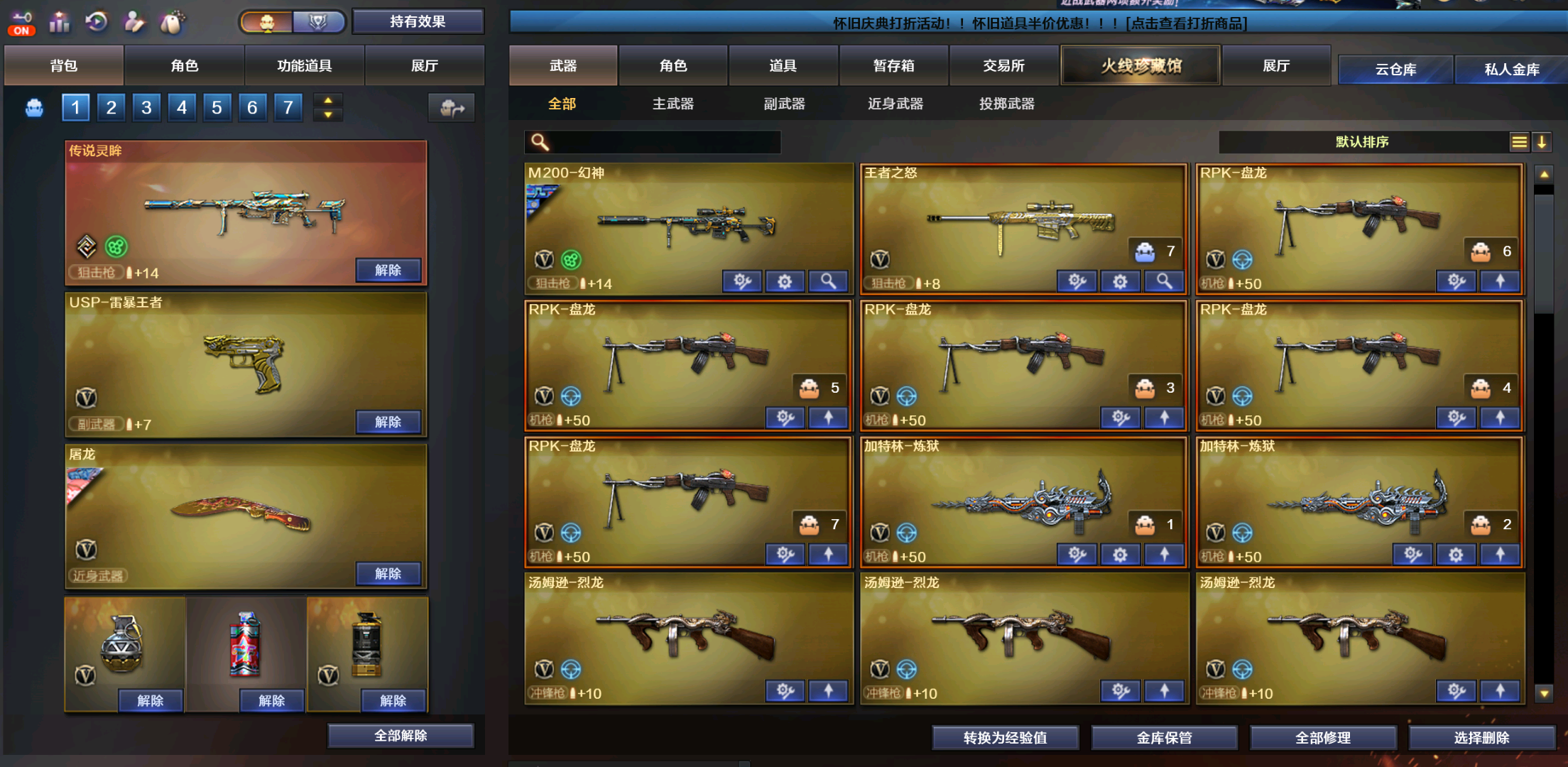 四防神威莲华+蝴蝶刀+炼狱+六盘龙+六烈龙+传说灵眸;USP-雷暴王者,炽芒蝶刃,RPK-盘龙,QBZ03-金色蔷薇,M200-幻神,传说灵眸,