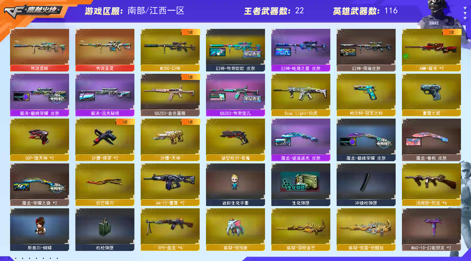 【泡泡象】+【蝴蝶刀】+六盘+六烈+蝴蝶+幻神+幻神欧欧+QBZ宠儿+雷神宠儿+3cop+柯尔特冠 【泡泡象】+六盘+六烈+蝴蝶+幻神+幻神欧欧+QBZ宠儿+雷神宠儿+3cop+柯尔特冠;柯尔特-冠军之特,炽芒蝶刃,RPK-盘龙,QBZ03-金色蔷薇,炼狱-泡泡象,M200-幻神,Scar Light-白虎,