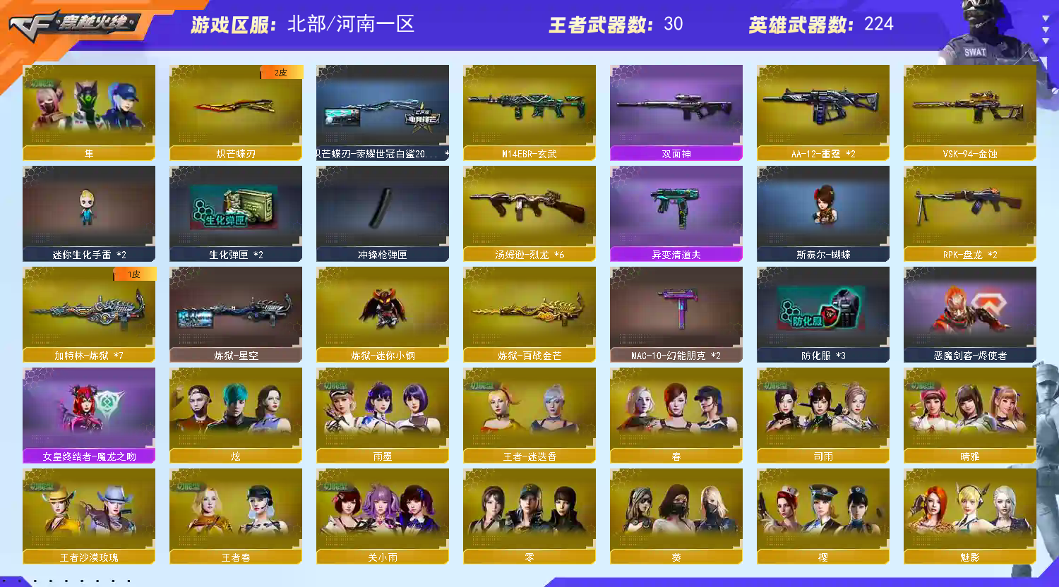 首页 > 租号大厅 > 穿越火线 > 北部/河南一区 > 双全天花板|满副满雷+5P幻神+裁决流光三件套+QBZ白虎三件套+炽芒/隼/六烈蝴蝶清道夫/六盘炼狱