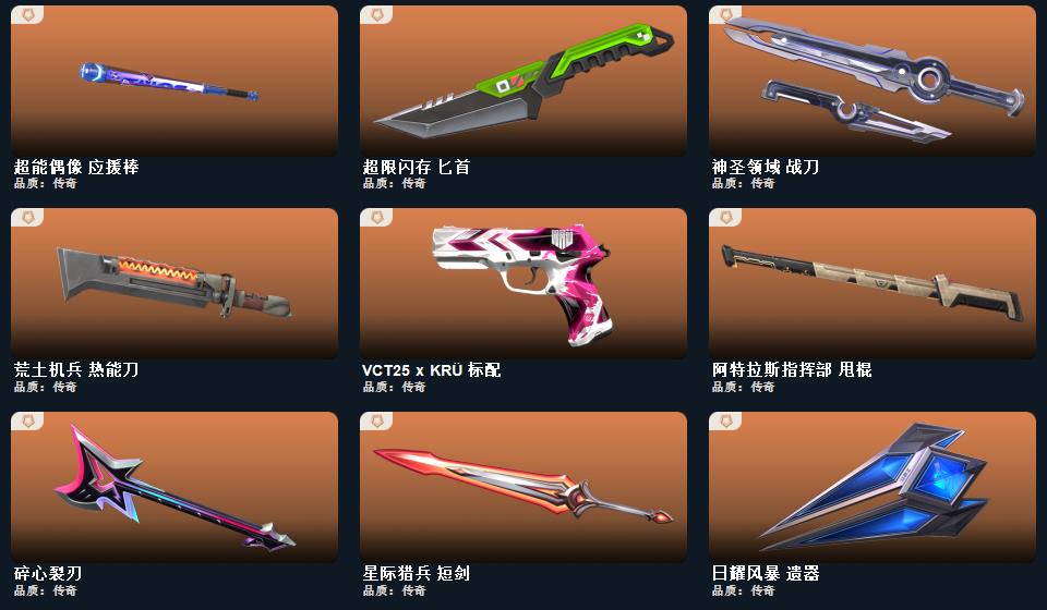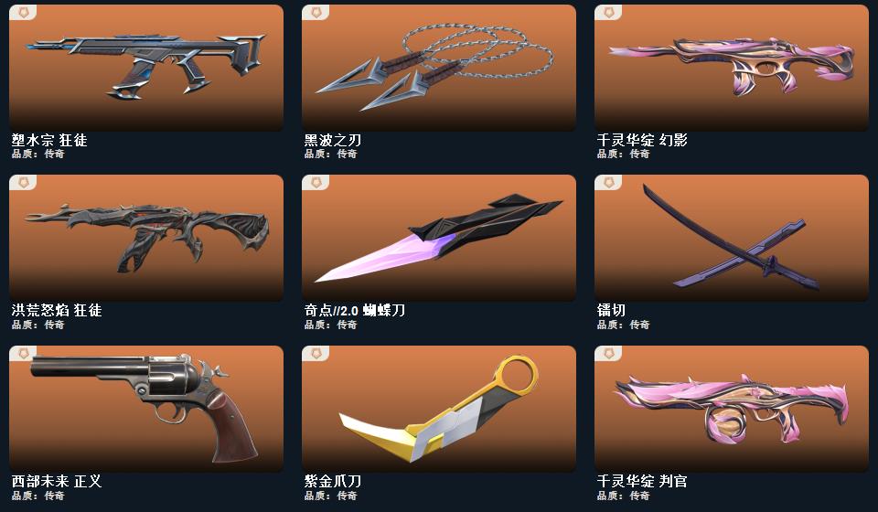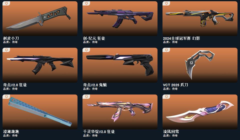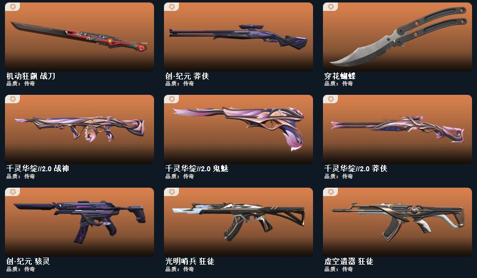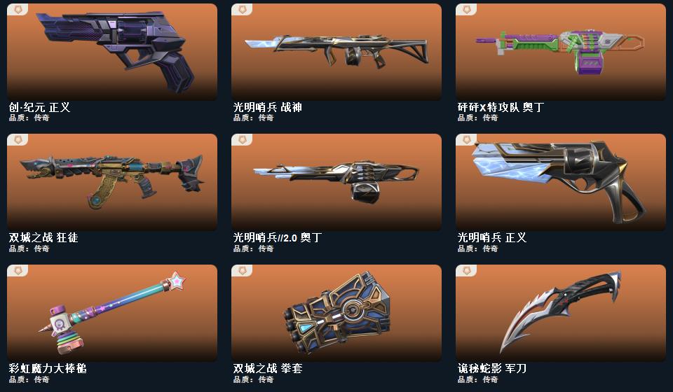 蒙太奇 狂怒,甜心猎手 短炮,诛心猎手 正义,千灵华绽//2.0 鬼魅,幻心猎手 鬼魅,星际猎兵 标配,光环序列 狂怒,瑰梦艺语 鬼魅,阿特拉斯指挥部 标配,太空穿梭 正义,悠闲猫生 短炮,日耀风暴 正义,甜蜜战术 鬼魅,幻语魔咒 狂怒,诡秘蛇影 鬼魅,末日之翼 短炮,折光棱晶 标配,西部未来 正义,星云暗涌 鬼魅,创·纪元 正义,VCT25 x KRÜ 标配,神圣领域 狂怒,月球哨兵 正义,耀鳞威龙 鬼魅,纳米打击 正义,荒土机兵 标配,逆冲蛮牛 狂怒,超限闪存 正义,奇点