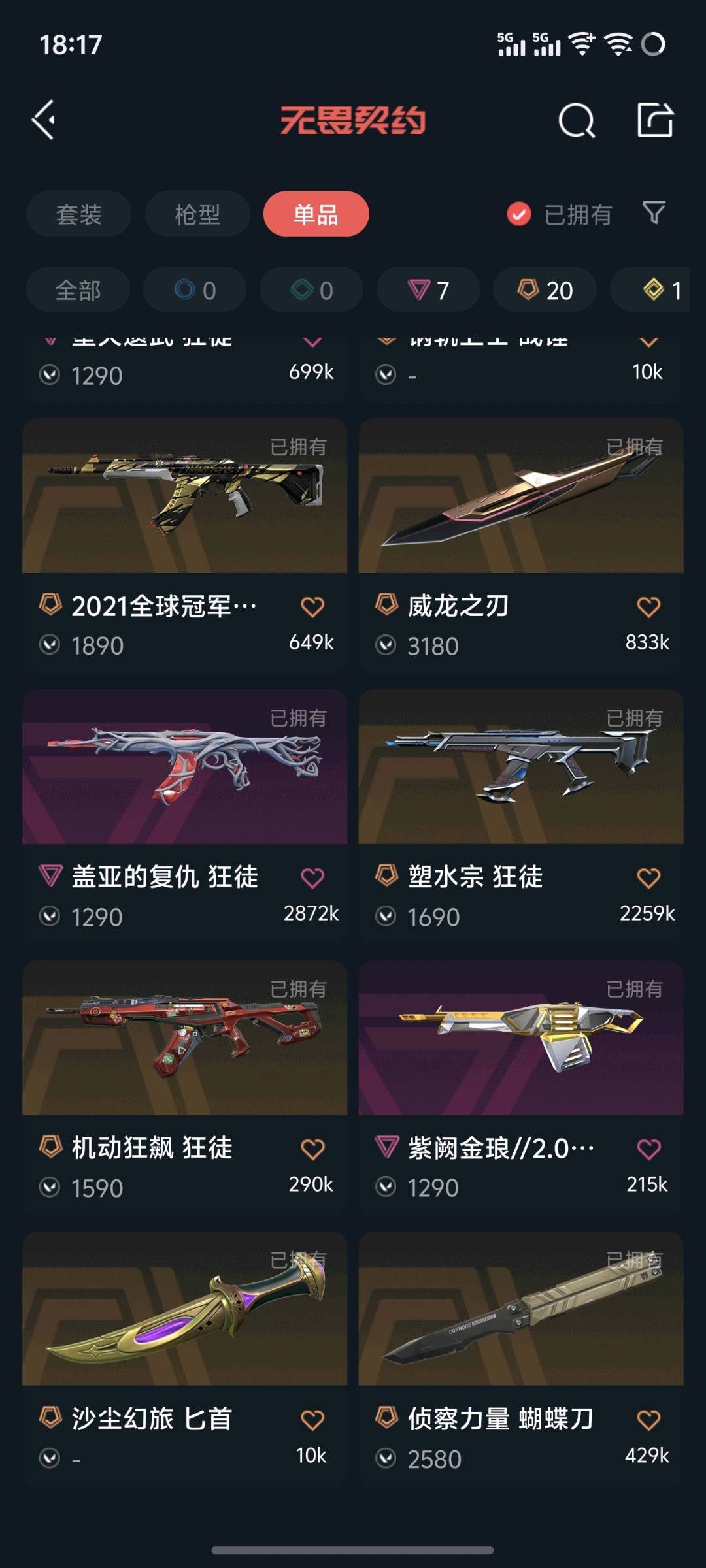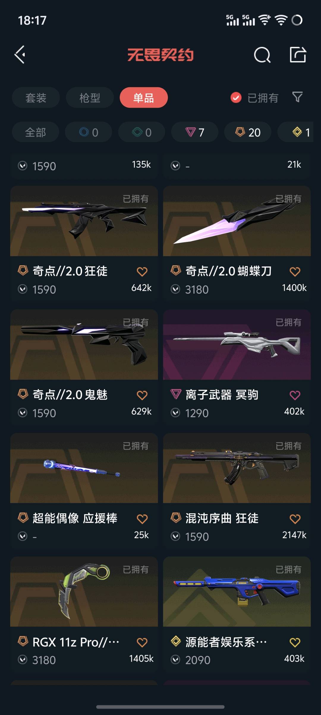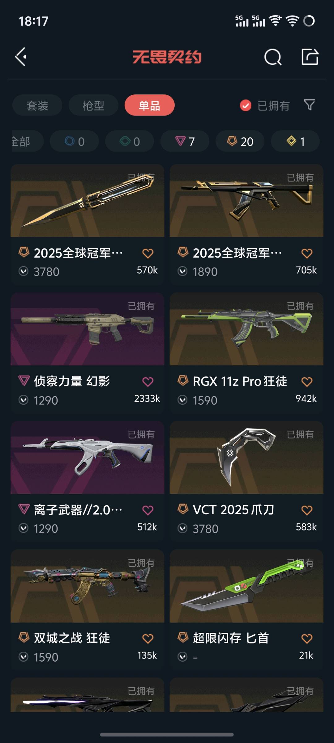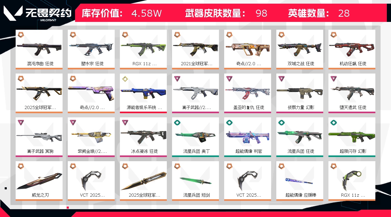 允许 英雄27 武器皮肤数量98可以使用道具;威龙之刃,VCT 2025 爪刀,盖亚的复仇 狂徒,源能者娱乐系统 幻影,侦察力量 幻影,RGX 11z Pro 狂徒,堕天遗武 狂徒,