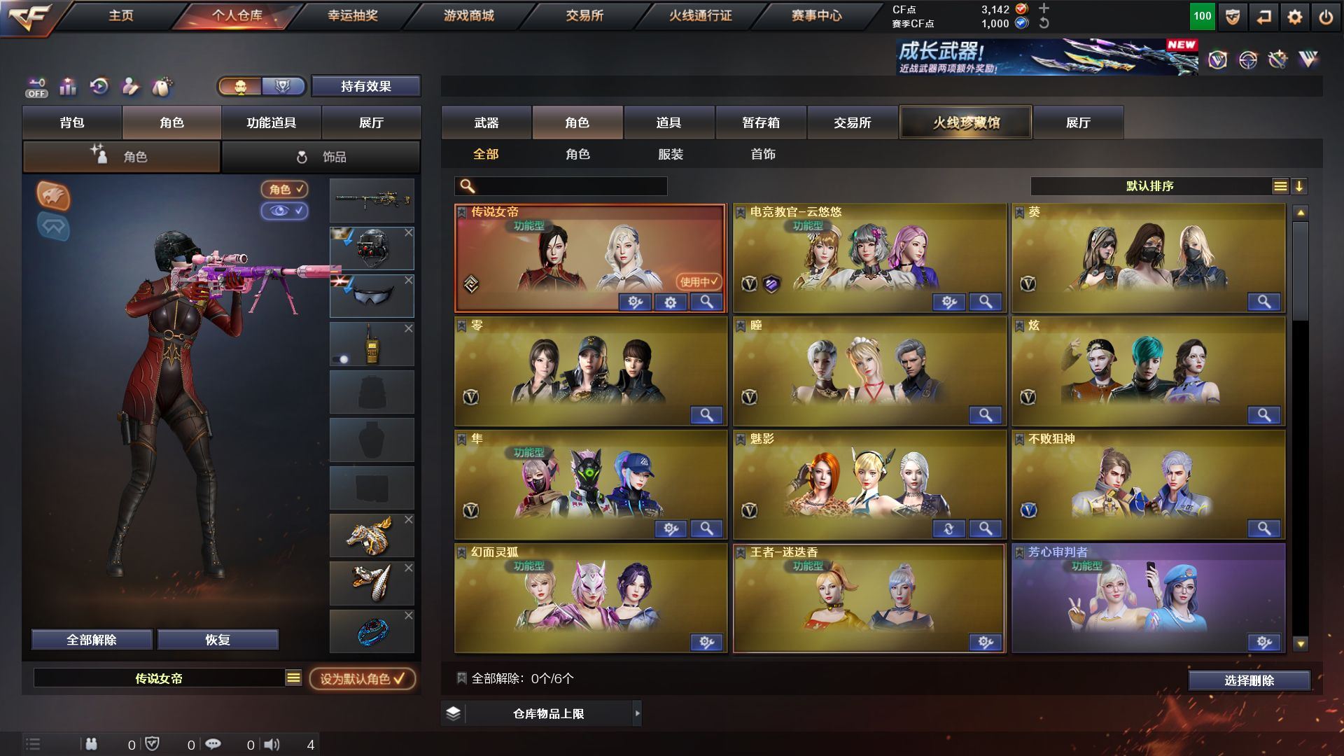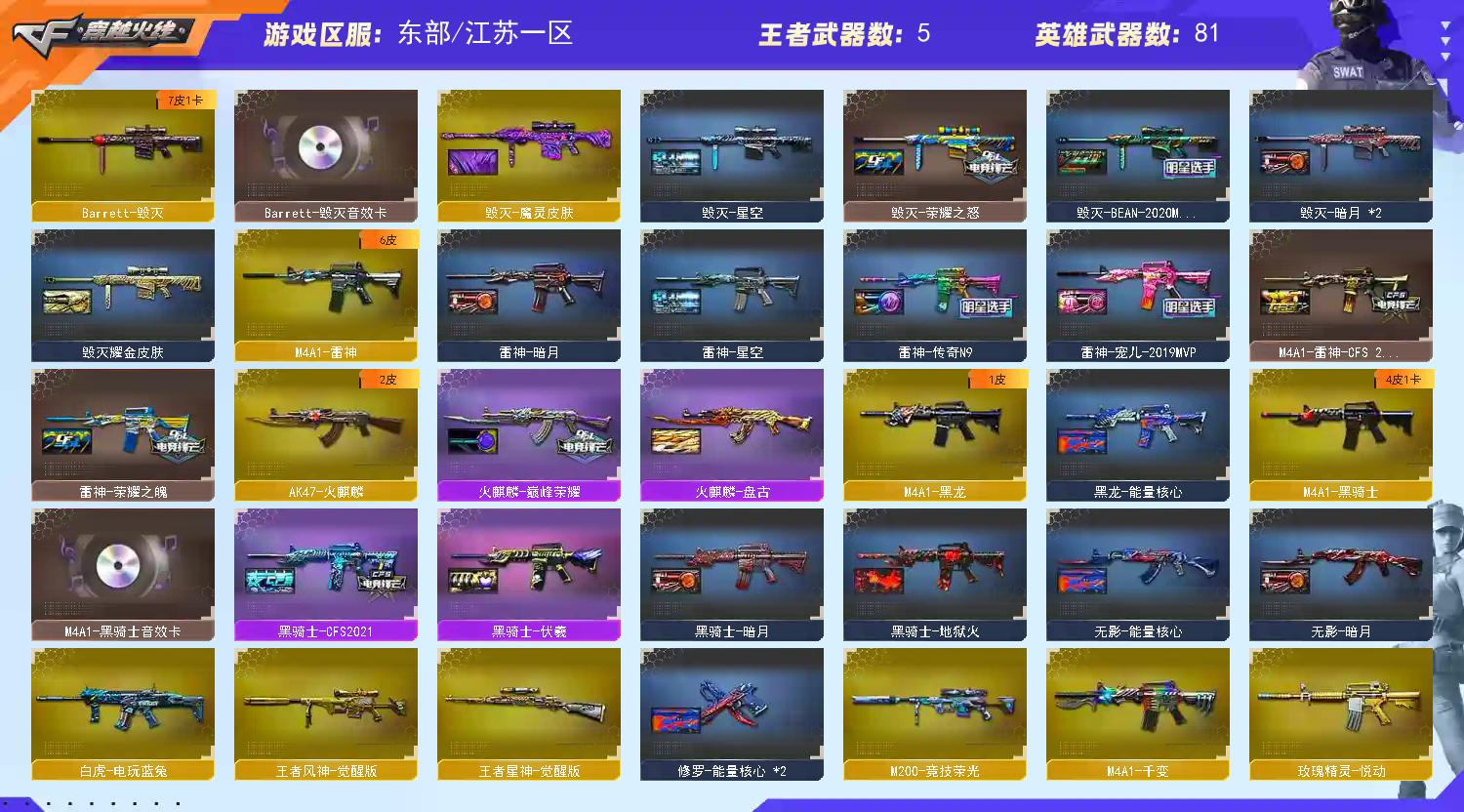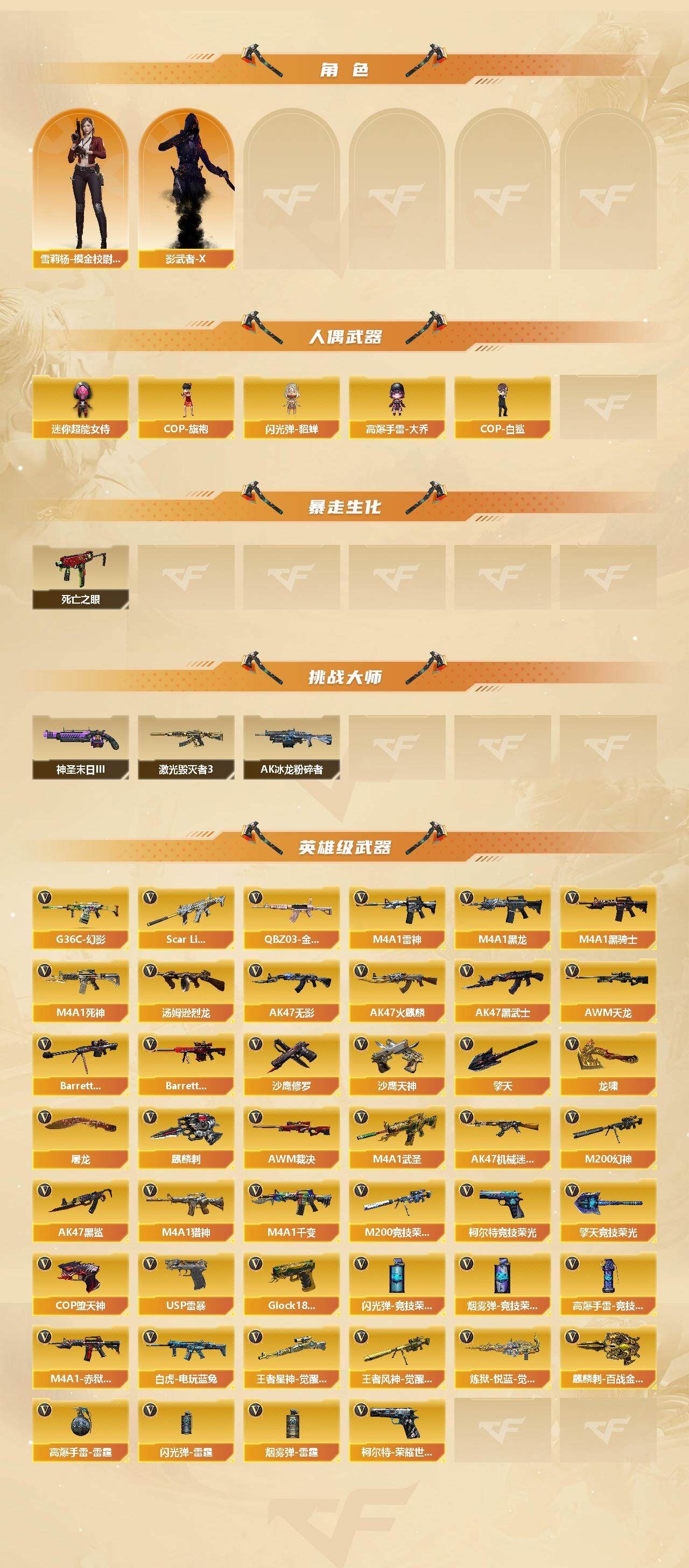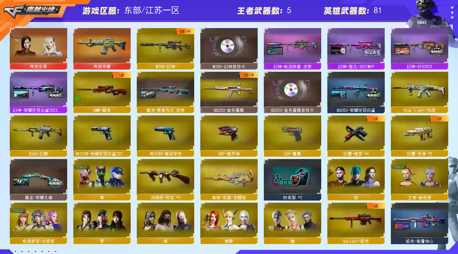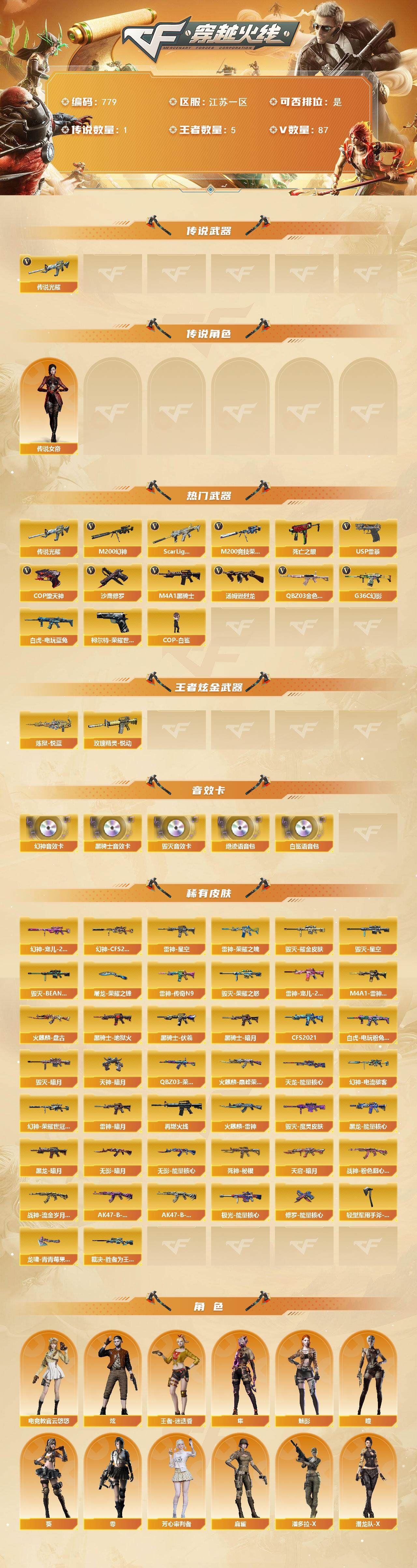 【传说女帝】【传说光耀】【G36C-幻影,QBZ03-金色蔷薇,Scar Light-白虎,M200-幻神,柯尔特-荣耀世冠白鲨2023,M200-竞技荣光,死亡之眼*2,白虎-电玩蓝兔,M4A1-黑骑士,汤姆逊-烈龙*3,COP-白鲨,USP-雷暴,COP-堕天神,沙鹰-修罗*4】【英雄级武器:M4A1-千变,AK47-火麒麟,M4A1-黑龙,M4A1-雷神,M4A1-黑骑士,AK47-无影,M4A1-死神,AK47-黑武士,M4A1-武圣,AK47-机械迷城*2,AK47-黑鲨,Scar Light-白虎,G36C-幻影,QBZ03-金色蔷薇,M4A1-猎神,白虎-电玩蓝兔,AWM-天龙,Barrett-毁灭,Barrett-极光,AWM-裁决,M200-幻神,M200-竞技荣光,王者星神-觉醒版,王者风神-觉醒版,炼狱-悦蓝-觉醒版,汤姆逊-烈龙*3,沙鹰-修罗*4,沙鹰-天神*2,USP-雷暴,COP-堕天神,柯尔特-荣耀世冠白鲨2023,柯尔特-竞技荣光,Glock18-武圣,屠龙*3,龙啸*2,擎天*3,麒麟刺,擎天-竞技荣光*2,麒麟刺-百战金芒,高爆手雷-雷霆*4,高爆手雷-竞技荣光*4,闪光弹-雷霆*4,闪光弹-竞技荣光*4,烟雾弹-雷霆*4,烟雾弹-竞技荣光*4,M4A1-赤狱骑士】【零,葵,瞳,魅影,炫,电竞教官-云悠悠,隼,王者-迷迭香,芳心审判者,麻雀,潘多拉-X,潜龙队-X,雪莉杨-摸金校尉,影武者-X】【M200-幻神音效卡,M4A1-黑骑士音效卡,Barrett-毁灭音效卡,绝迹语音包,白鲨语音包】【幻神-宠儿-2021MVP,幻神-CFS2022,幻神-电流骇客 皮肤,幻神-荣耀世冠白鲨2023 皮肤,白虎-电玩粉兔皮肤,QBZ03-荣耀世冠白鲨,裁决-胜者为王 皮肤,雷神-暗月,雷神-荣耀之魄,雷神-星空,M4A1-雷神-CFS 2019,雷神-传奇N9,雷神-宠儿-2019MVP,M4A1-再燃火线,火麒麟-雷神,火麒麟-盘古,火麒麟-巅峰荣耀,毁灭-暗月*2,毁灭-荣耀之怒,毁灭耀金皮肤,毁灭-星空,毁灭-BEAN-2020MVP,毁灭-魔灵皮肤,黑龙-能量核心,黑龙-暗月,黑骑士-暗月,黑骑士-地狱火,黑骑士-CFS2021,黑骑士-伏羲,无影-暗月,无影-能量核心,死神-秘银*2,天启-暗月,战神-粉色甜心皮肤,战神-流金岁月皮肤,AK47-B-常胜将军-曹操,AK47-B-常胜将军-刘备,天龙-能量核心,极光-能量核心,修罗-能量核心*2,天神-暗月*2,屠龙-荣耀之锋,轻型军用手斧-再燃火线,龙啸-青青莓果 皮肤】【人偶武器:COP-白鲨,COP-旗袍,闪光弹-貂蝉,高爆手雷-大乔,迷你超能女侍】【BS战队炫彩背包,CFS限定背包,EDG炫彩背包,R.LGD炫彩背包,WE炫彩背包,XROCK炫彩背包,战舰背包,炫彩背包,百战金芒炫彩背包,虎牙炫彩背包,超级背包*2,救世主-黑桃战神,绿色巨人,灵魂忍者,变异宝贝,迷雾幽灵,夺命之镰,防化服*2,流光-鎏金之域,流光-再燃火线,枪王排位29赛季金色流光,零-水下丽影表情,电玩兔兔表情,防弹头盔*3,防弹衣*3,C4工具钳*2,手雷包*2】;USP-雷暴,柯尔特-荣耀世冠白鲨2023,传说女帝,隼,电竞教官-云悠悠,QBZ03-金色蔷薇,G36C-幻影,