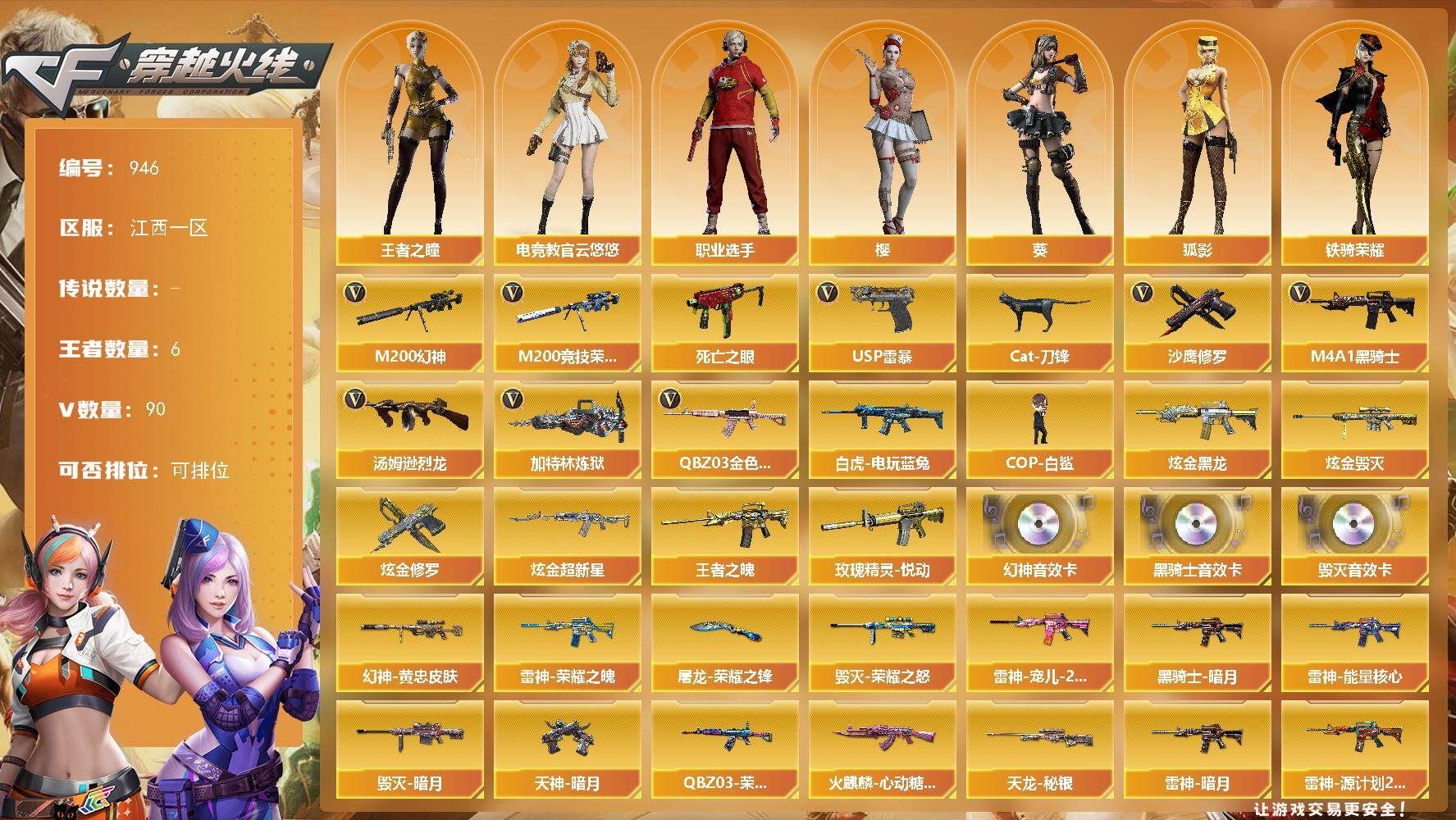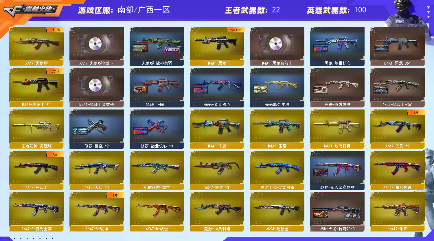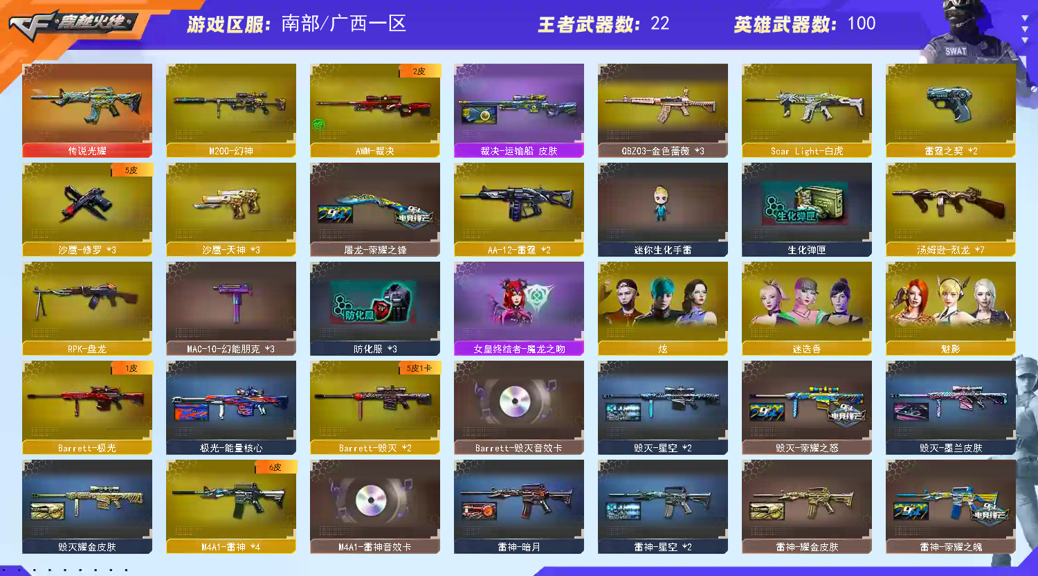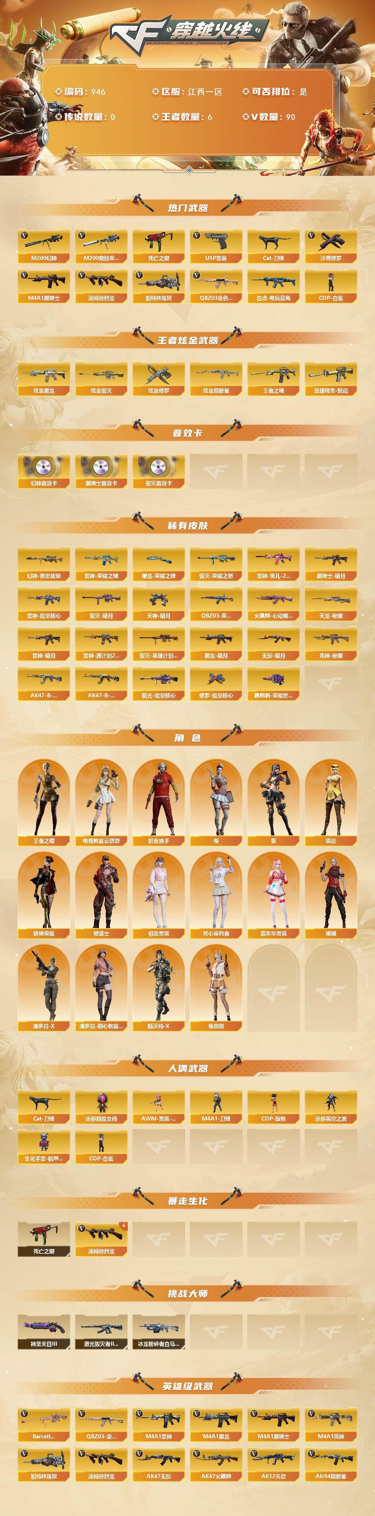 【传说武器】:传说光耀【热门武器】:传说光耀,QBZ03-金色蔷薇*3,Scar Light-白虎,HK417-朱雀,M200-幻神,死亡之眼,王者炎心,M4A1-黑骑士*2,汤姆逊-烈龙*7,RPK-盘龙,降世魔童,COP-白鲨,沙鹰-修罗*3,金刚伞【王者炫金武器】:王者炎心,王者之翼,王者之武,王者之影,王者之心,王者之光*3,王者之怒*2,王者之力,炼狱-悦蓝,王者之灵,炫金火麒麟,炫金骑士,炫金无影,炫金雷神,炫金武士*2,炫金毁灭【音效卡】:AK47-火麒麟音效卡,M4A1-黑龙音效卡,M4A1-黑骑士音效卡,Barrett-毁灭音效卡【皮肤】:裁决-运输船 皮肤,烈龙-星空,雷神-暗月,雷神-荣耀之魄,雷神-星空*2,雷神-耀金皮肤,雷神-源计划2.0专属 皮肤,火麒麟-战神关羽,毁灭-荣耀之怒,毁灭耀金皮肤,毁灭-星空*2,M4A1-千变-孔明皮肤,黑龙-能量核心,黑龙-暗月,M4A1-黑龙-361,黑骑士-暗月,无影-能量核心,无影耀金皮肤,无影-霓裳皮肤,AK47-黑武士-361,战神-粉色甜心皮肤,战神-紫绶金章皮肤,战神-流金岁月皮肤,AWM-天龙-传奇70KG,极光-能量核心,修罗-能量核心*3,修罗-星空*2,屠龙-荣耀之锋,屠龙-惊鸿 皮肤【角色】:魅影,炫,迷迭香,炽天使,暗夜-X,北极狐-X,风暴女,嘉年华灵狐,娟娟,兰-海滩派对,兰-新年限定,灵狐者-X,灵狐者-职业经理,龙儿,麻雀,潘多拉-X,邱刚敖,青霞仙子,蛇姬,铁骑-乘风破浪,铁骑荣耀,新娜塔莎,雪莉杨,影武者-X,雅典娜【人偶武器】:COP-白鲨,天龙-曼陀罗,火麒麟-灵狐,M4A1-雷神-精英刀锋,AWM-灵狐-15周年嘉年华,COP-旗袍,迷你波特博士,夺魂,迷你生化手雷,深渊终结者手雷,闪光弹-小乔,迷你巨石泰坦-魔花研究所,灵狐娃娃手雷,降世魔童【暴走生化】:死亡之眼,超级对讲机【挑战大师】:AK47-冰龙粉碎者,冰龙粉碎者-白马银枪,阐释者III【英雄级武器】:M4A1-千变,AK47-火麒麟,M4A1-黑龙,M4A1-雷神*4,M4A1-黑骑士*2,AK47-无影*2,AK47-黑武士,AK12-天启*3,AN94-超新星,AK47-黑鲨*3,M4A1-龙血*2,M4A1-雷霆,HK417-朱雀,Scar Light-白虎,无影-神兵利器,M4A1-玫瑰精灵,QBZ03-金色蔷薇*3,王者之魄-觉醒版,王者之幻-觉醒版,AK-47-猩红传说,AK47-B-战神,黑武士-CF网剧冠军,AWM-天龙*2,Barrett-毁灭*2,Barrett-极光,AWM-裁决,M200-幻神,王者幻神-觉醒版,RPK-盘龙,汤姆逊-烈龙*7,AA-12-雷霆*2,沙鹰-修罗*3,沙鹰-天神*3,COP-雷霆*2,天神-CF网剧冠军,屠龙*5,龙啸*6,擎天,麒麟刺,擎天-CF网剧冠军,王者之锋-觉醒版,王者之啸-觉醒版,高爆手雷-雷霆*6,闪光弹-雷霆*6,烟雾弹-雷霆*6【道具】:XROCK炫彩背包,云山科技背包,全能枪王背包,战舰背包,炫彩背包,超级背包,女皇终结者-魔龙之吻,救世主-黑桃战神,妩媚妖姬,黄金生化钩,绿色巨人,灵魂忍者*2,变异宝贝,迷雾幽灵*2,生化弹匣,夺命之镰,防化服*3,金色流光-枪王排位,枪王排位28赛季金色流光,枪王排位29赛季金色流光,防弹头盔*6,防弹衣*6,C4工具钳*5,手雷包*6【特殊枪械】:1白虎,2黑骑士,6烈龙,1盘龙;RPK-盘龙,QBZ03-金色蔷薇,M200-幻神,Scar Light-白虎,